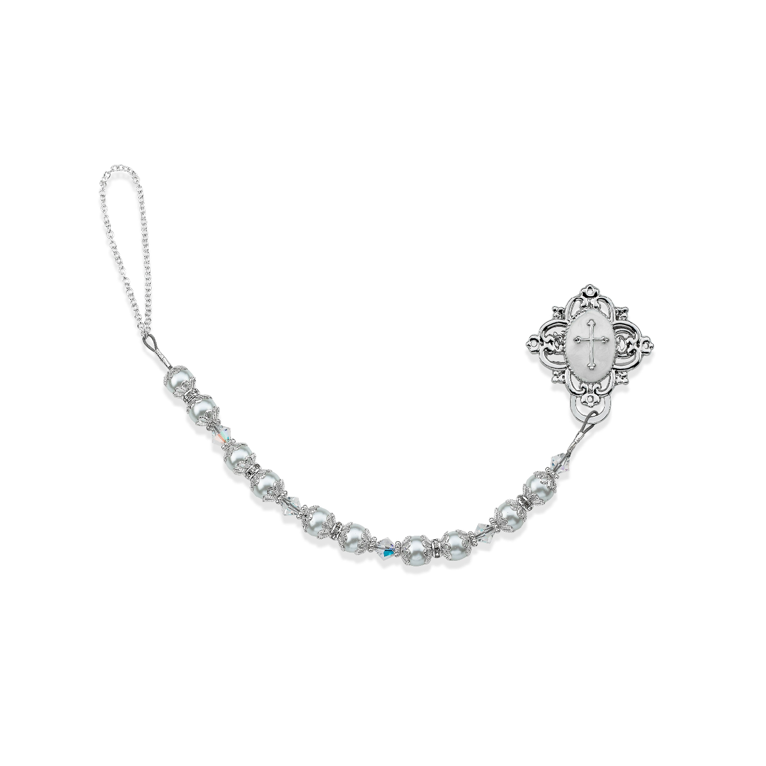 This adorable cross pacifier clip is made with stunning silver color bead caps, spacers and rondelles which give it so much sparkle and charm! Pearls are white color, this will be a show stopper and a conversation piece!