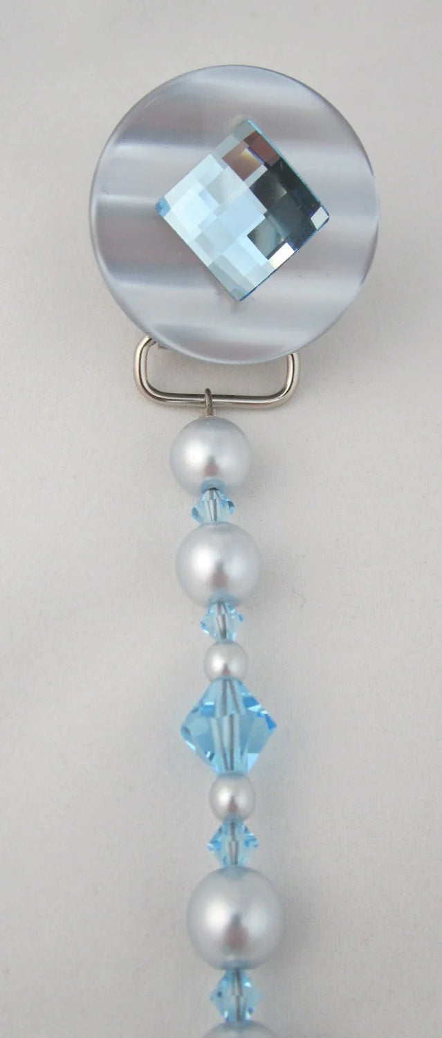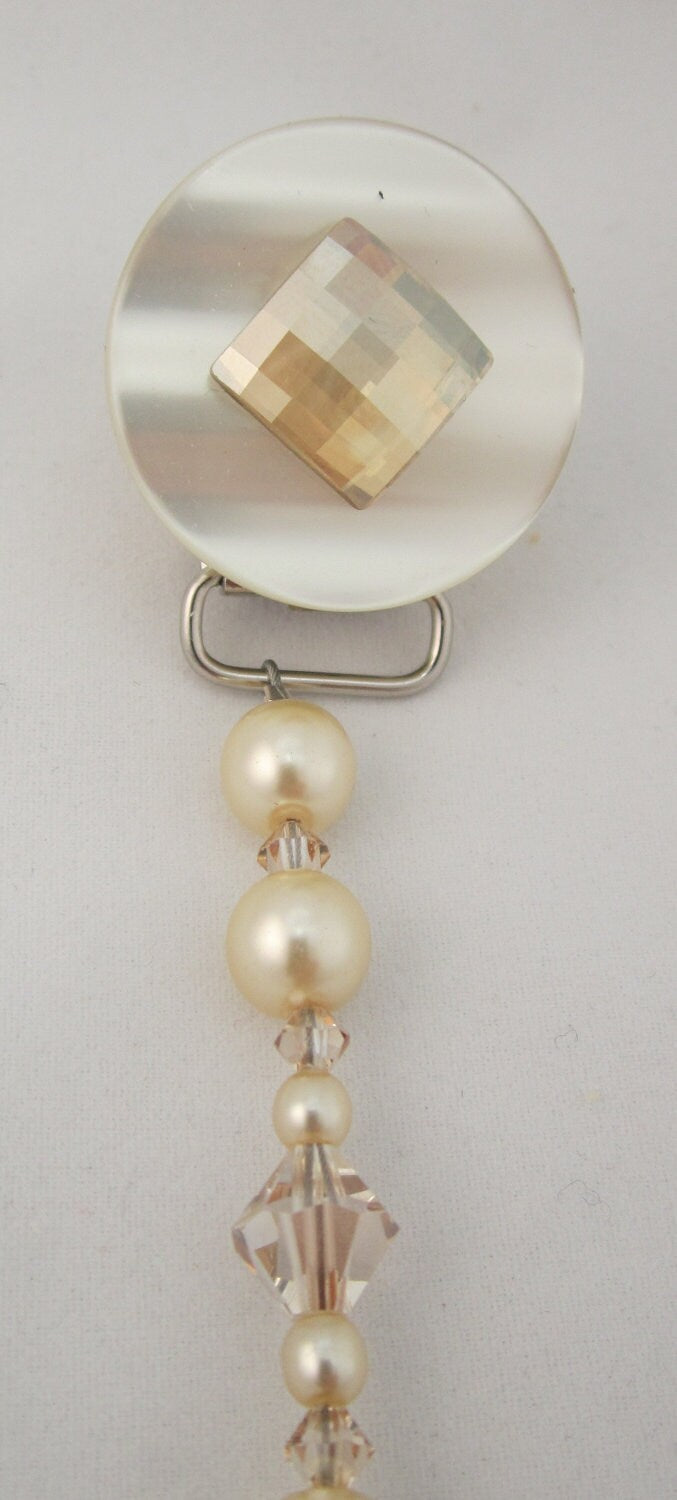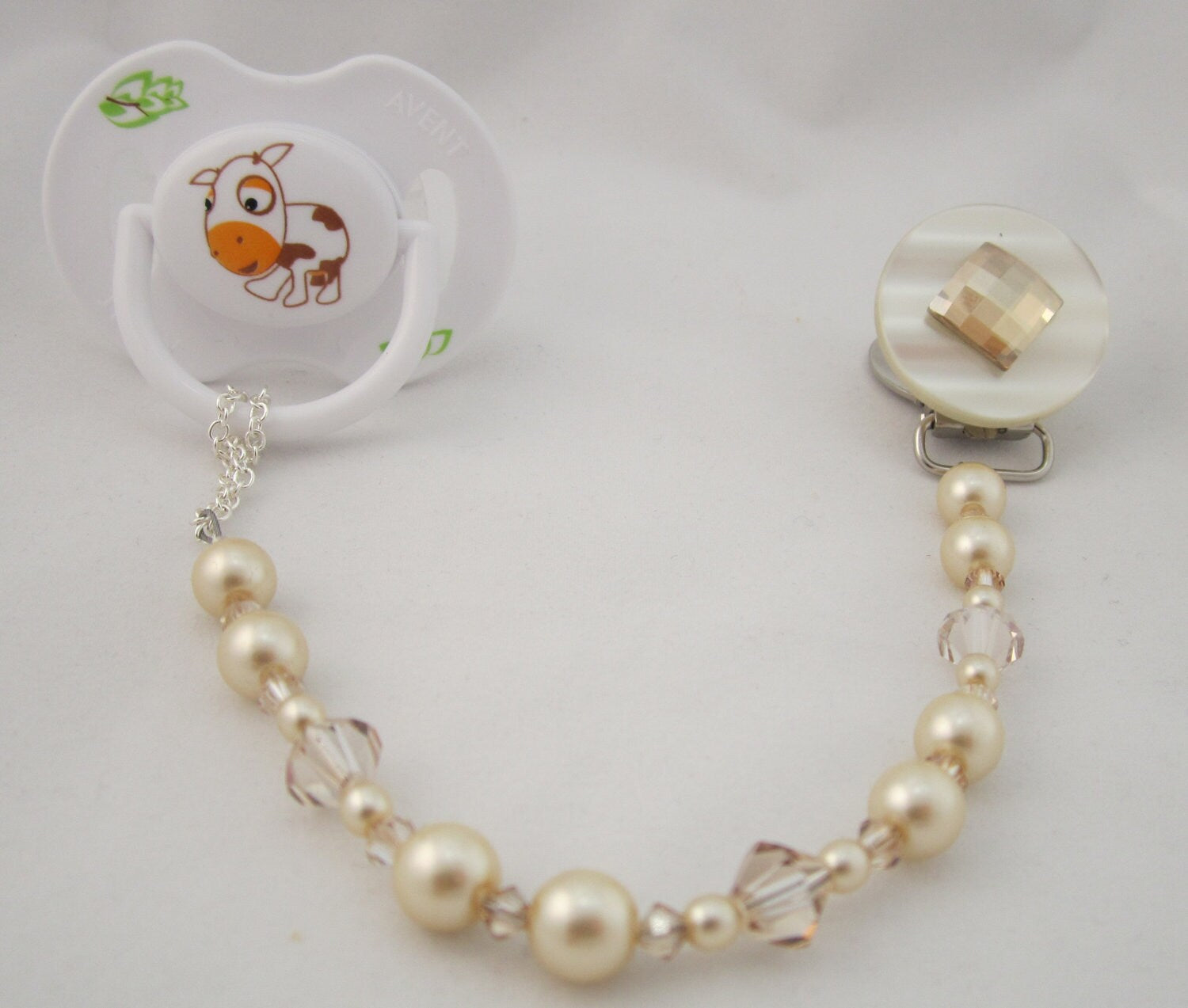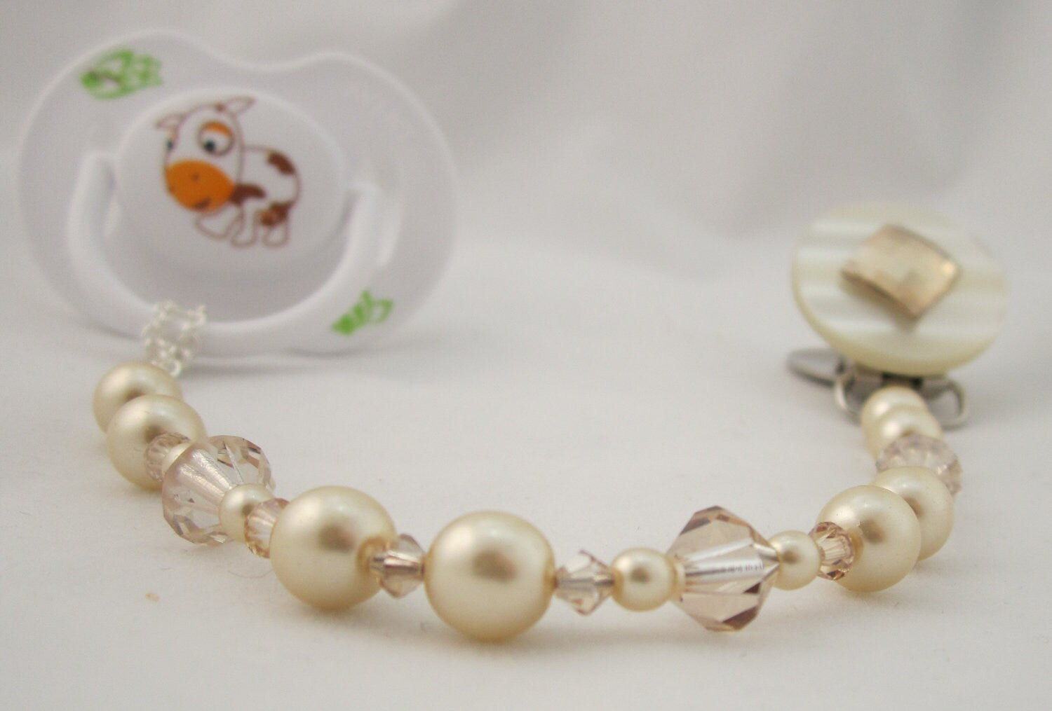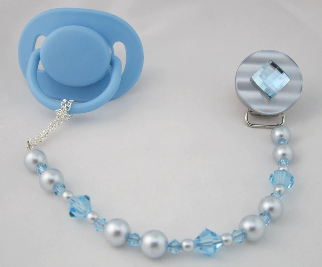 Beige, Blue Diamond Pacifier clip with Stunning Bling Beads and Pearls (CBLG,CBLB)