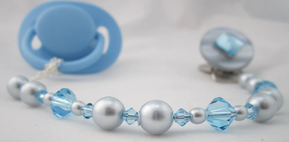 This clip fits all major brands of pacifiers. The beads are strung on 49 Strands of jewelry wire. Each end is triple-secured to guarantee quality and safety. Our team of Professionals Secure and Check each Clip Individually, The Beads are selected from a wide variety, to ensure that we bring you a safe, secure and Stunning Pacifier Clip.