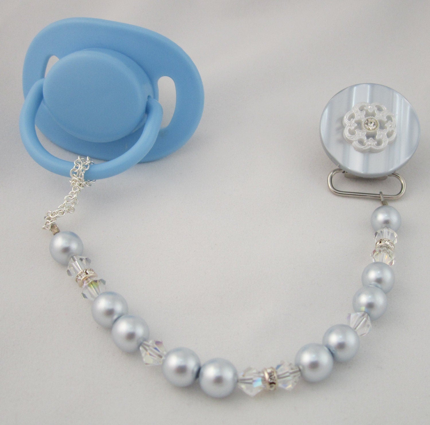Adorable Blue Lacy Flower Pacifier clip is accented with Stunning Pearls and Crystals