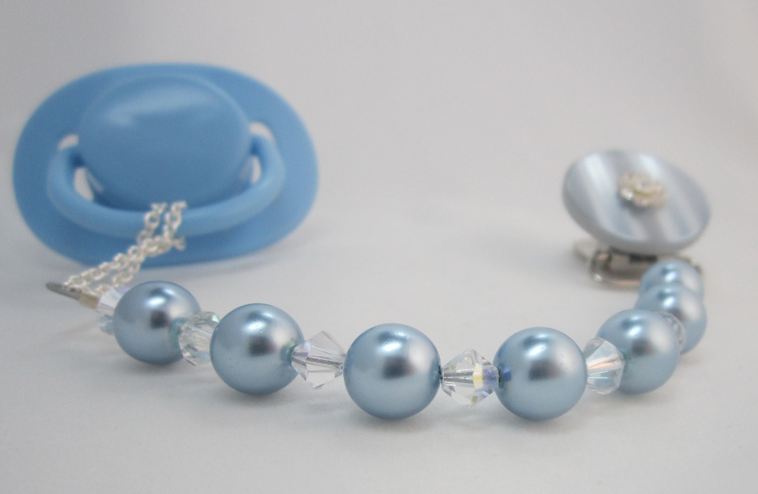 Adorable Blue pacifier clip is accented with Big Pearls and Austrian Crystals