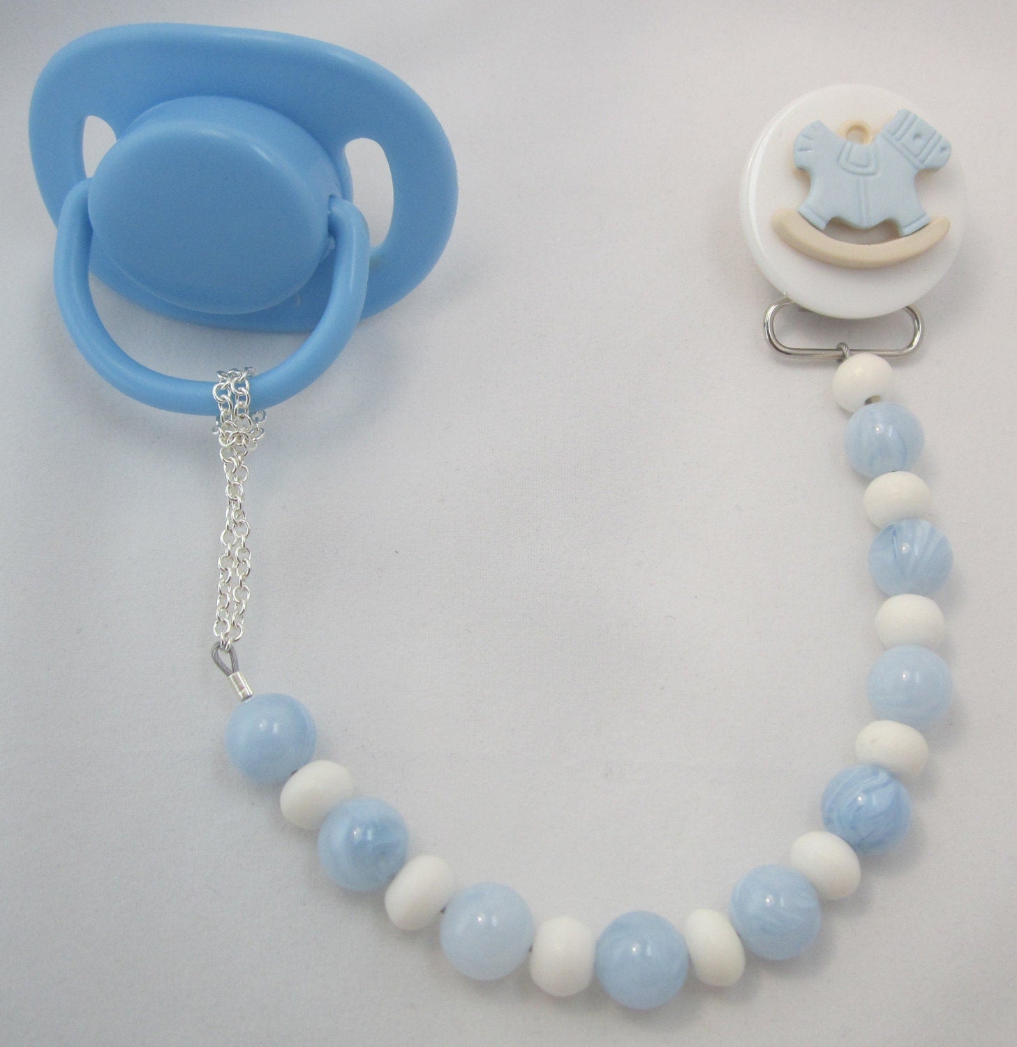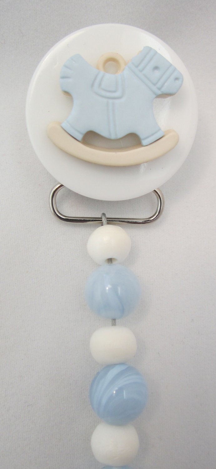 Adorable Blue Rocking Horse Pacifier clip is accented with Stunning Pearls and Beads