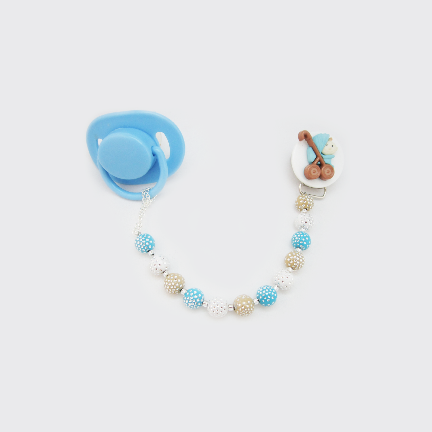Blue Stroller Pacifier clip with blue and White Acrylic beads (CPBS)