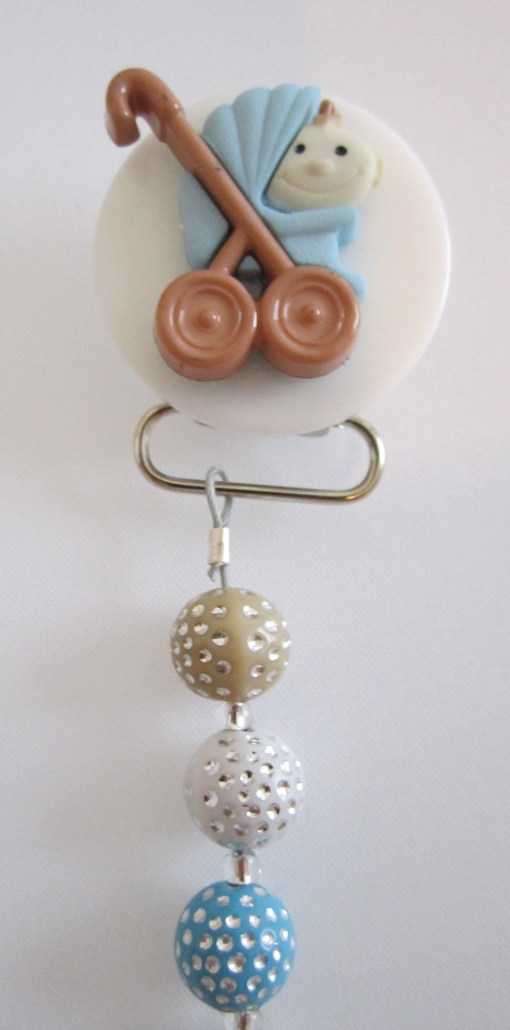 Adorable Blue Stroller pacifier clip is accented with Blue and white acrylic beads.