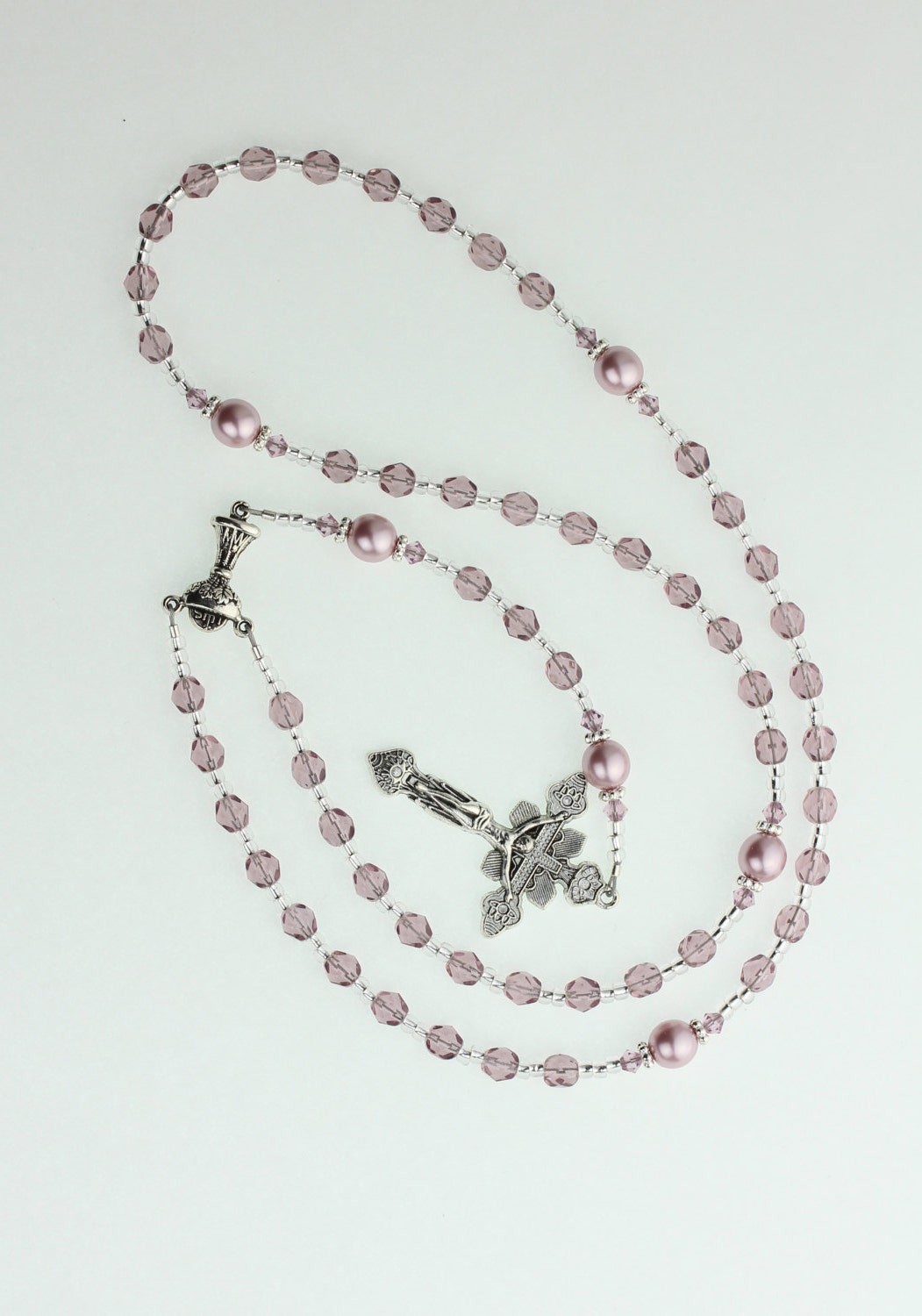 Catholic Rosary Prayer Bead necklace, lavender shade Pearls and Cathedral Crystals and Cross Necklace (RN10)