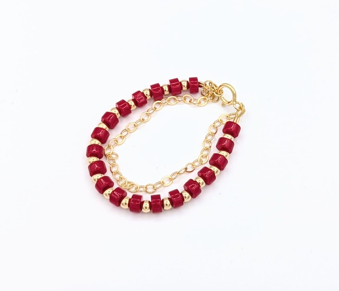 Coral and 14kt gold filled chain and beads bracelet (B2607)
