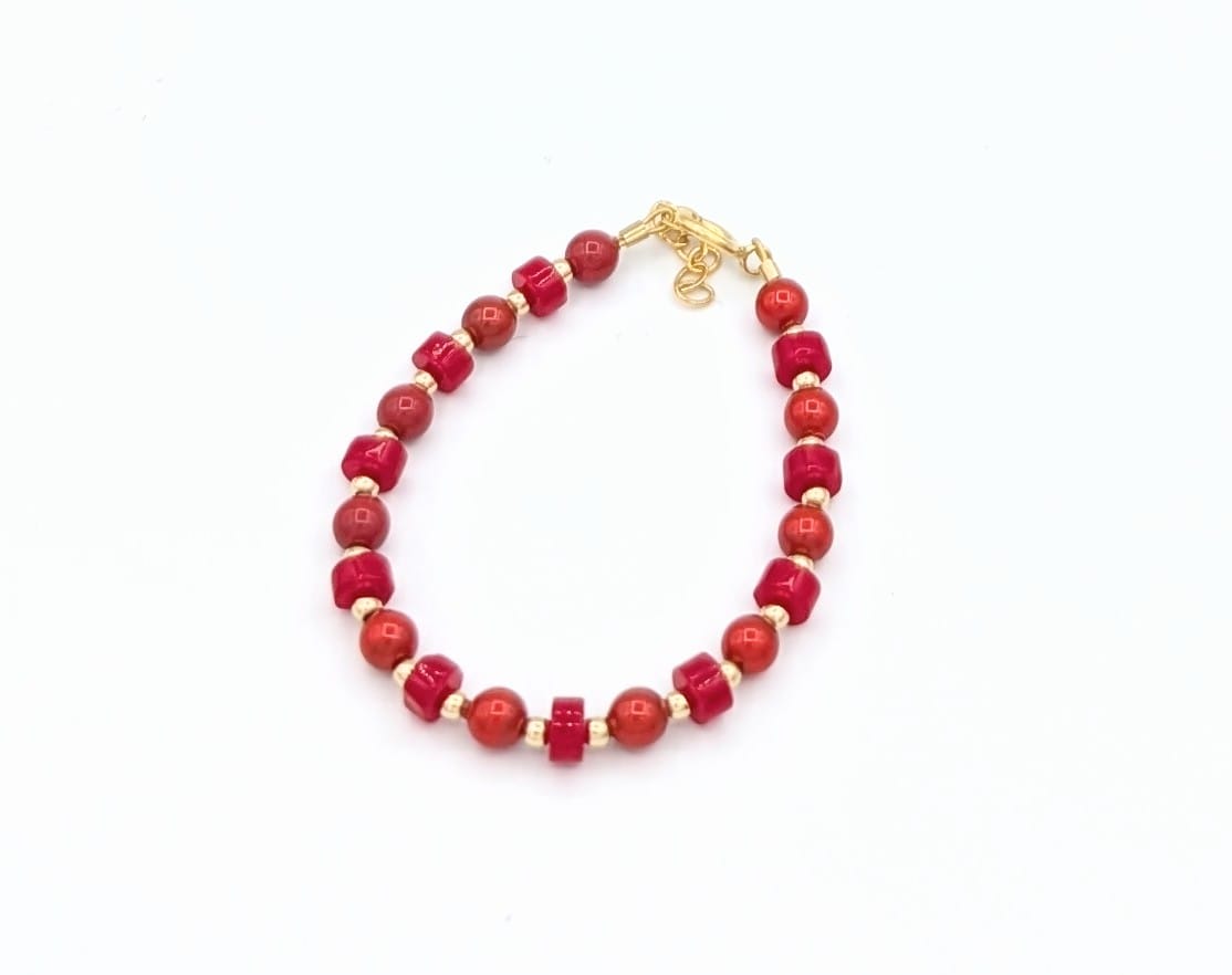 Add a vibrant and playful touch to your baby’s look with this beautifully handcrafted bracelet. Featuring a blend of coral and red beads paired with 14K gold-filled accents, this design creates a warm and eye-catching color combination. Carefully crafted, it offers a cheerful yet elegant accessory for everyday wear or special moments.