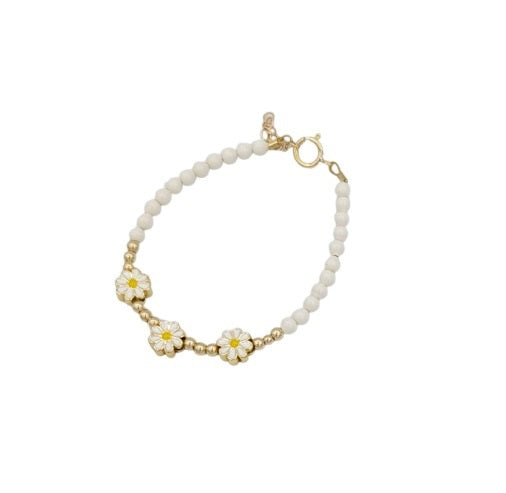 This Bracelet will look like a million on your baby's hand. It is made of white and 14kt gold filled beads and with 3 daisy flower charms.