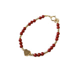 This Bracelet will look like a million on your baby's hand. It is made of 14k yellow gold-filled components, red pearls and pearl heart bead.