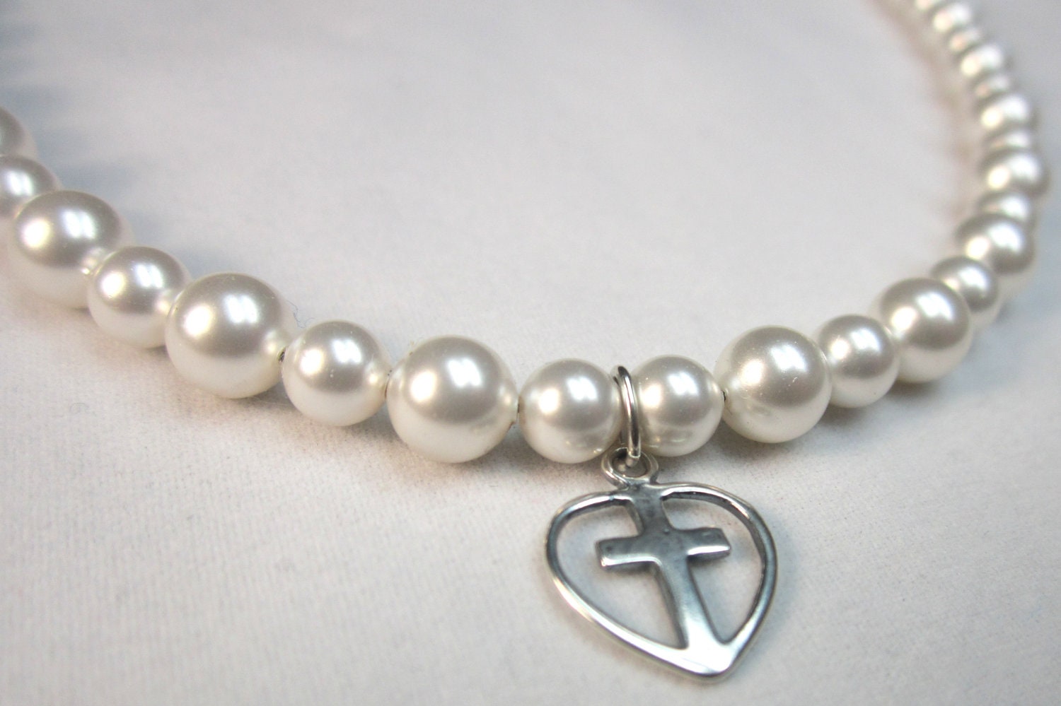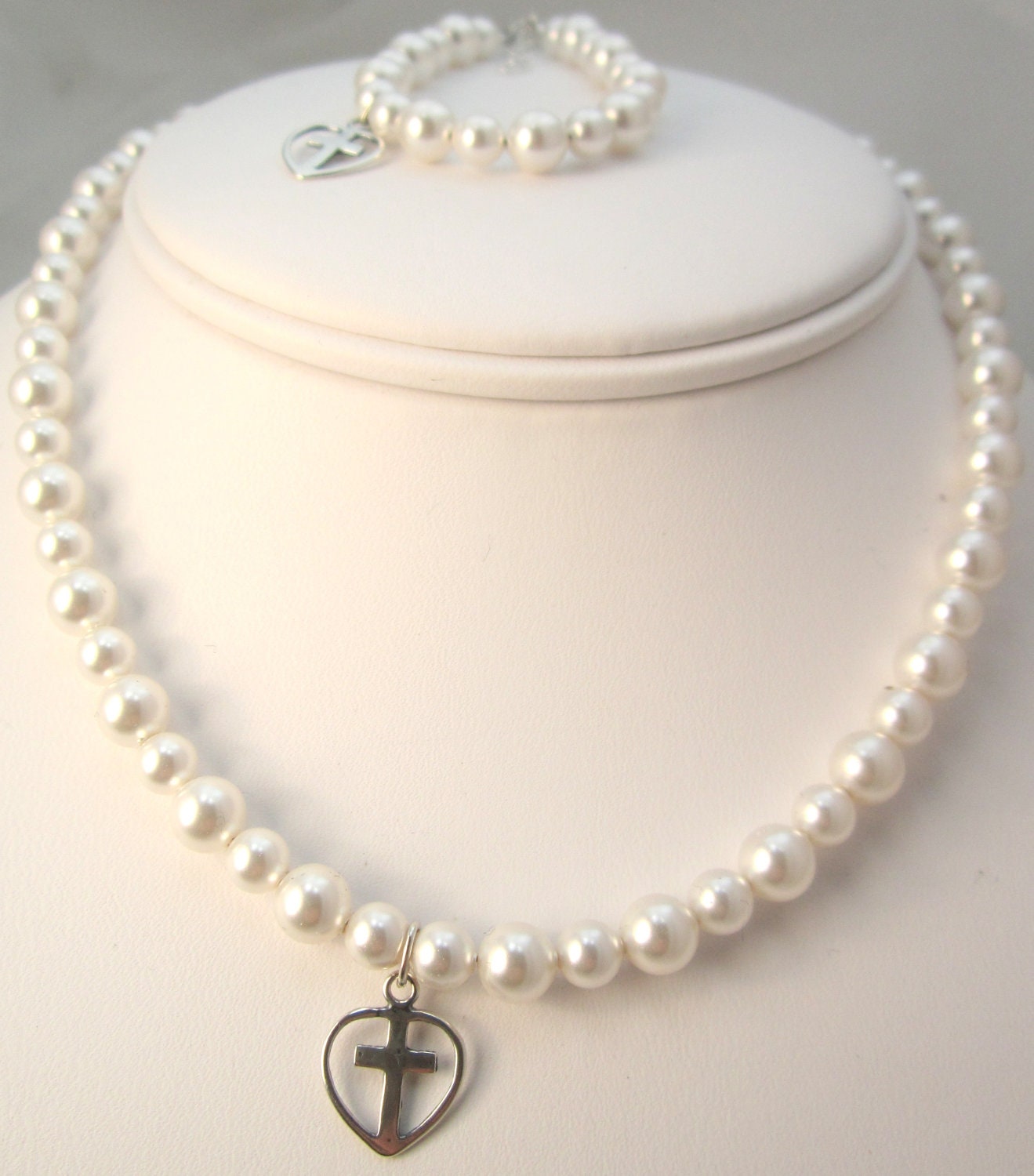I loved making this necklace, I used 5mm and 6mm Austrian white pearls, and a sterling silver cross set in a heart charm,