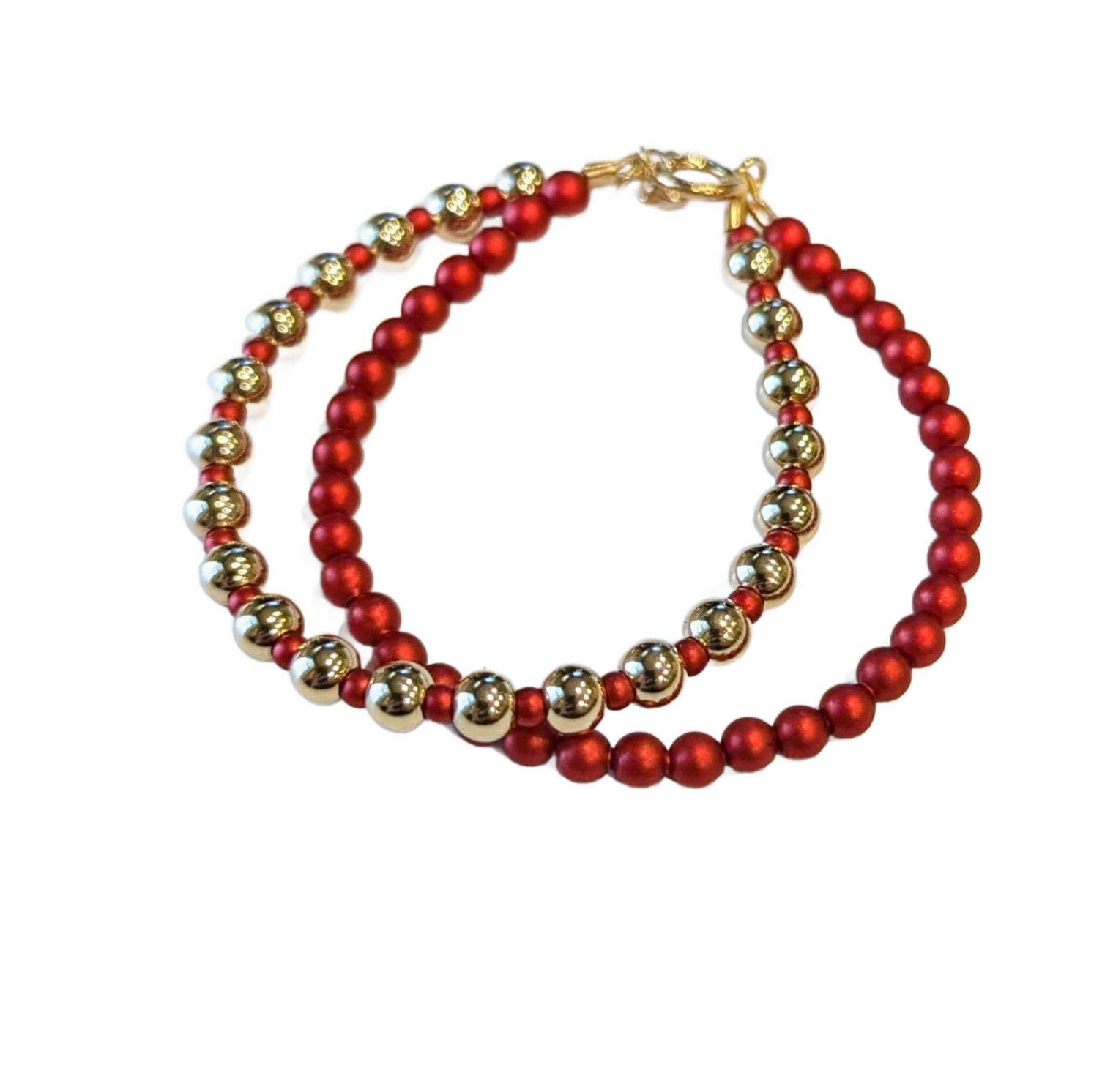 This Layered look red and gold double bracelet will look like a million on your baby's hand. The pearls and beads are strung on 49 Strands of jewelry wire. Each end is triple-secured to guarantee quality and safety.