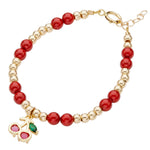 This little cherry love bracelet will look like a million on your baby's hand. It is made of red pearls, 14k gold filled beads and 14k gold filled cherry pendant. The pearls and beads are strung on 49 Strands of jewelry wire. Each end is triple-secured to guarantee quality and safety.