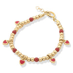 This Bracelet will look like a million on your baby's hand. It is made of red and 14kt gold filled beads and multiple red and gold heart charms.