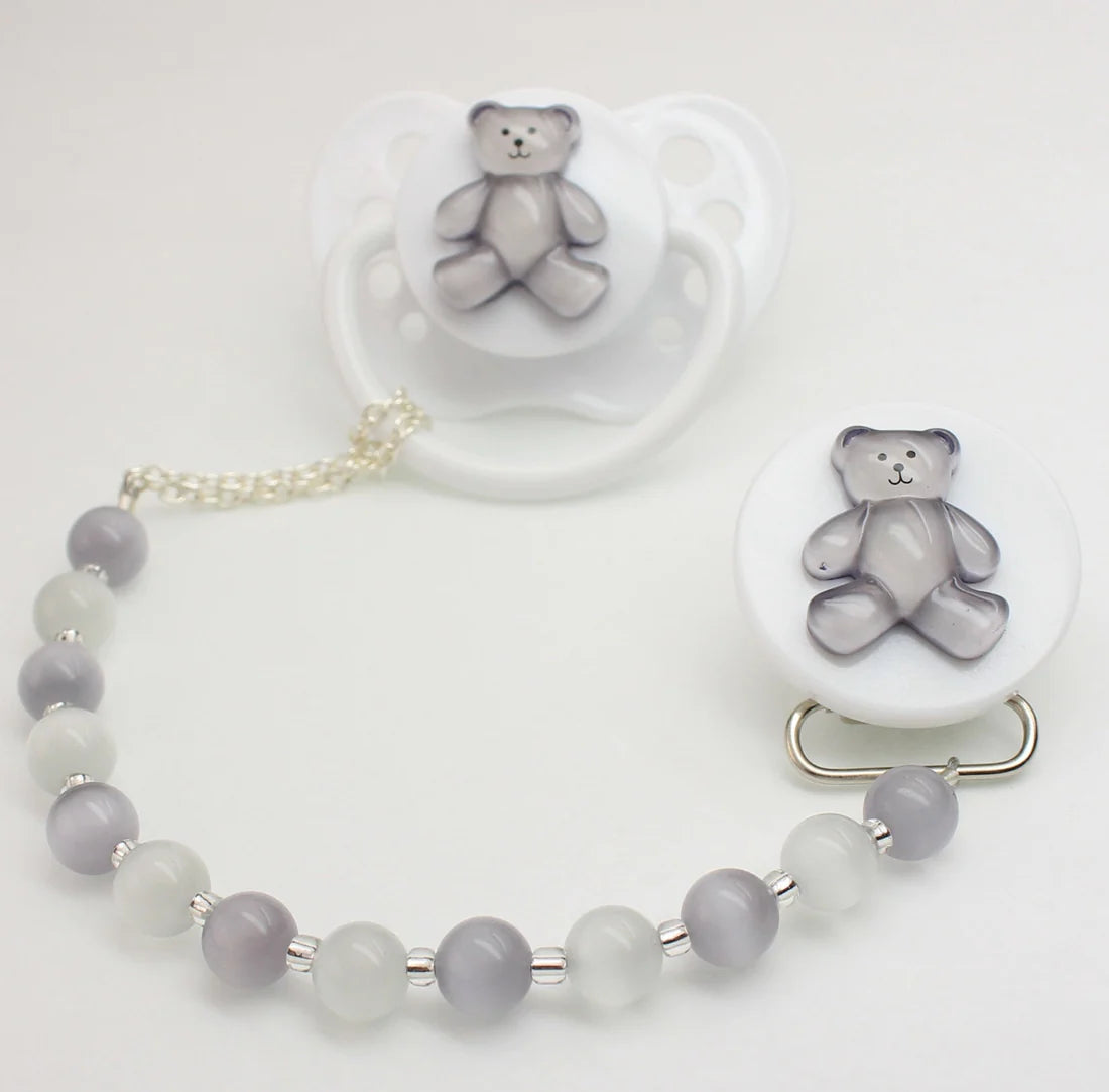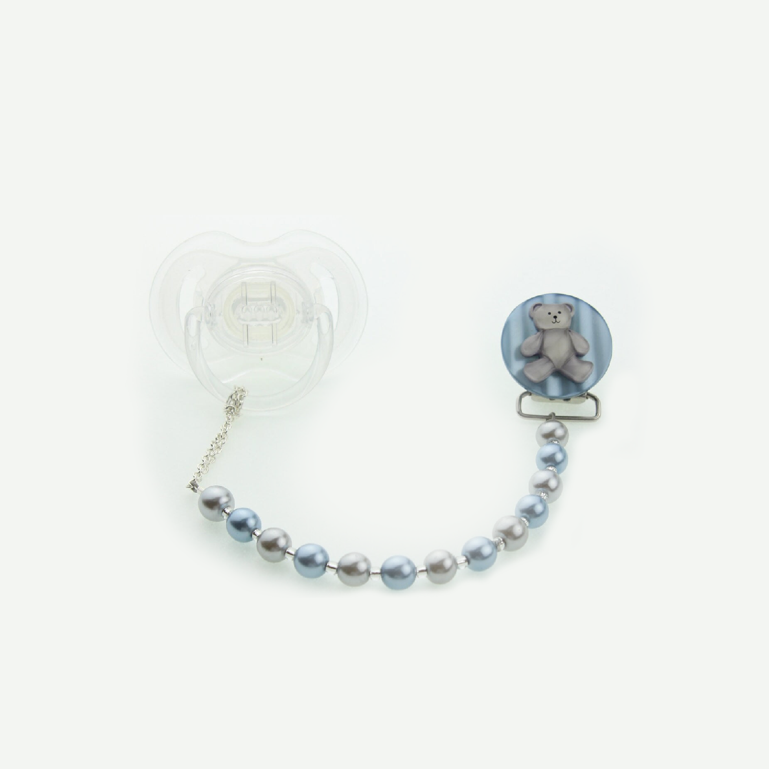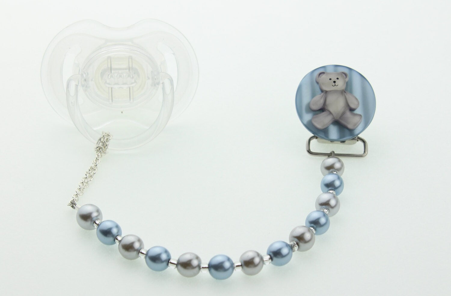 Adorable Boy Teddy bear Pacifier Clip Gray and Blue Pearls