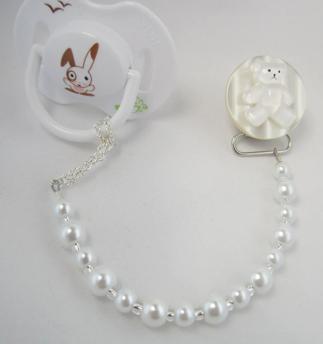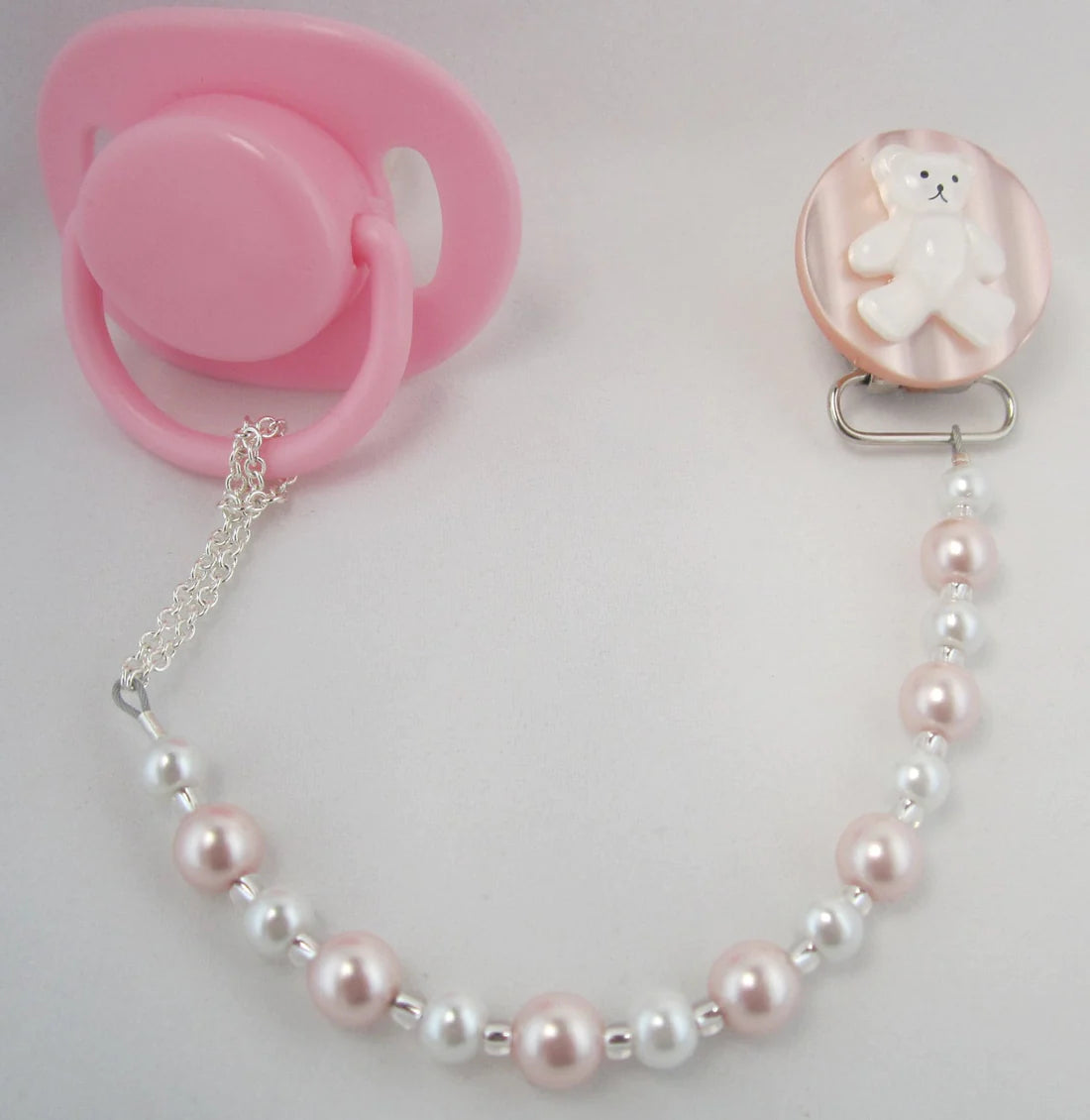 This clip fits all major brands of pacifiers. The beads are strung on 49 Strands of jewelry wire. Each end is triple-secured to guarantee quality and safety. Our team of Professionals Secure and Check each Clip Individually, The Beads and Pearls are selected from a wide variety, to ensure that we bring you a safe, secure and Stunning Pacifier Clip.