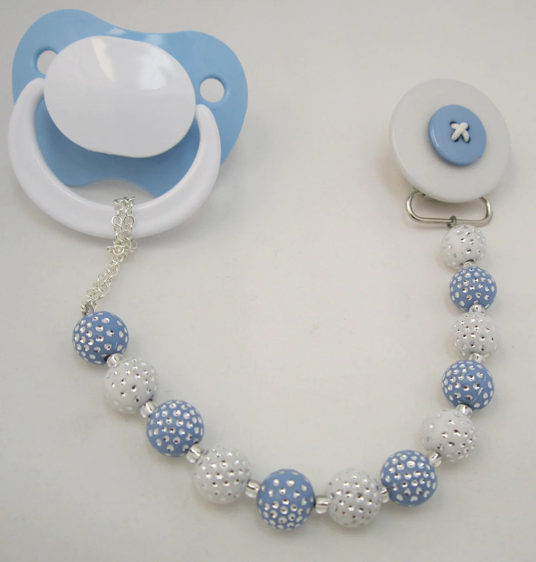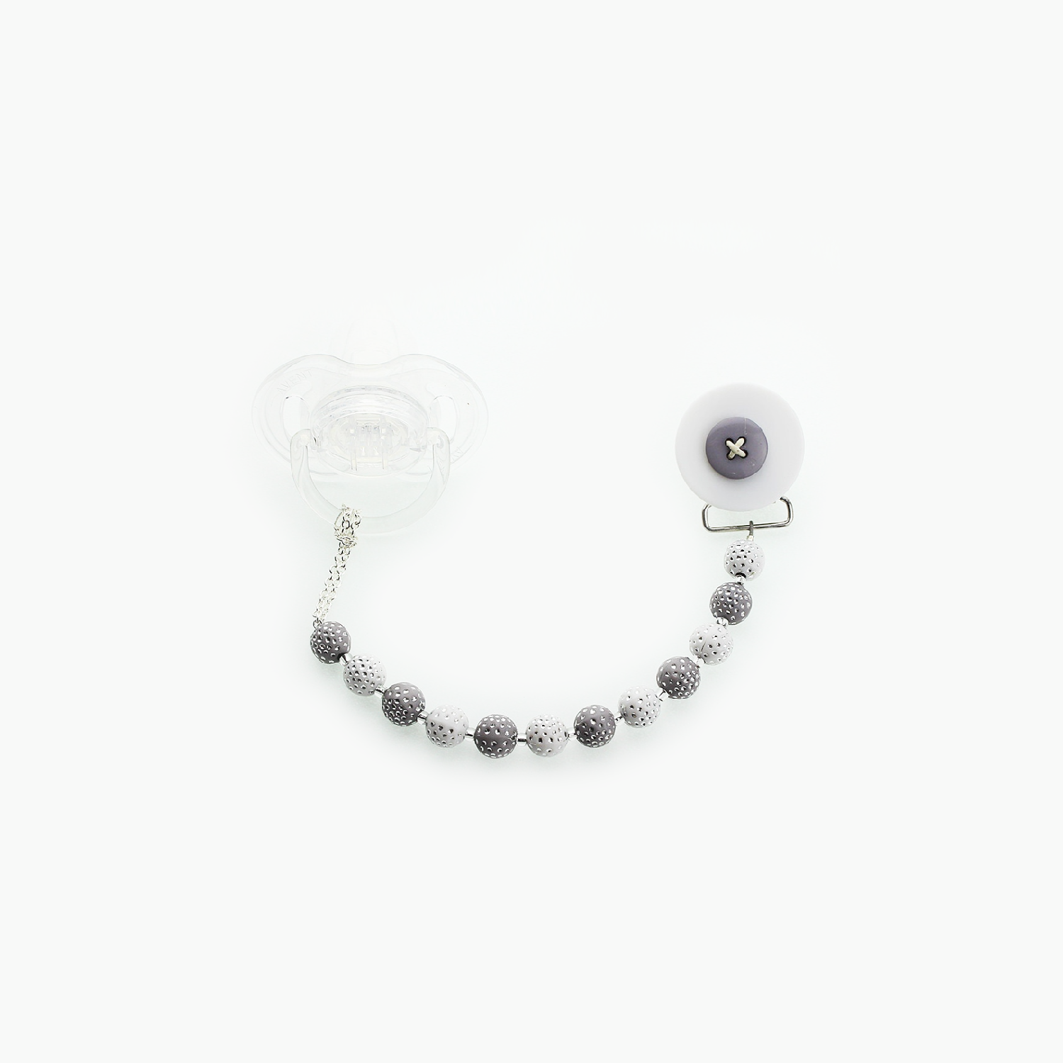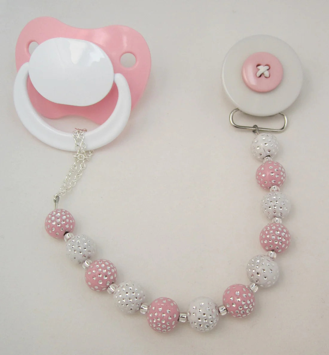 This clip fits all major brands of pacifiers. The beads are strung on 49 Strands of jewelry wire. Each end is triple-secured to guarantee quality and safety. Our team of Professionals Secure and Check each Clip Individually, The Beads are selected from a wide variety, to ensure that we bring you a safe, secure and Stunning Pacifier Clip.