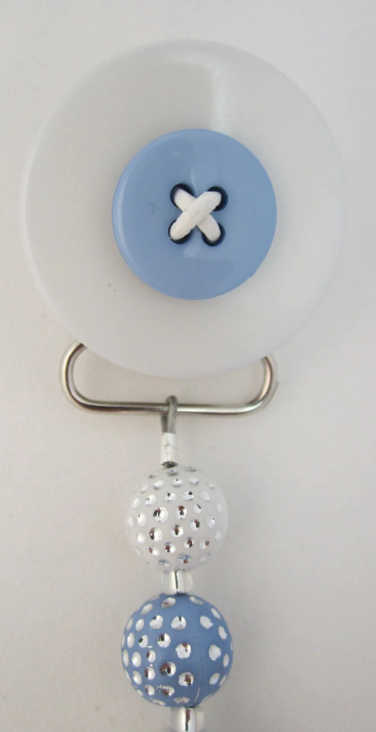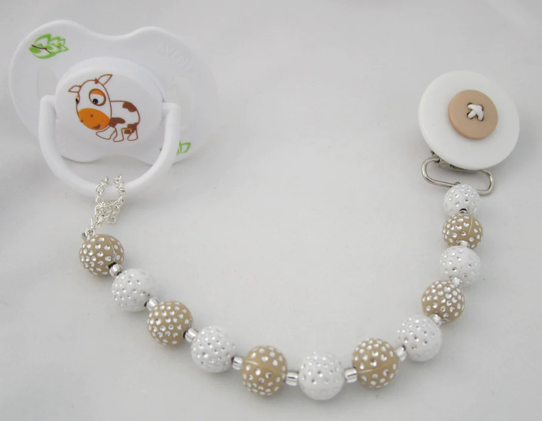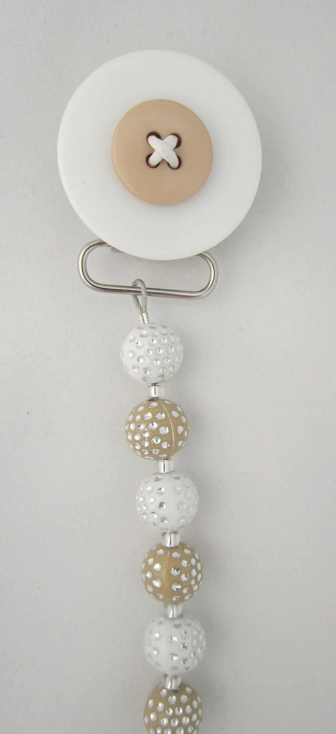 Adorable Gray, Tan, Blue, Pink Button Pacifier clips are accented with Acrylic Beads