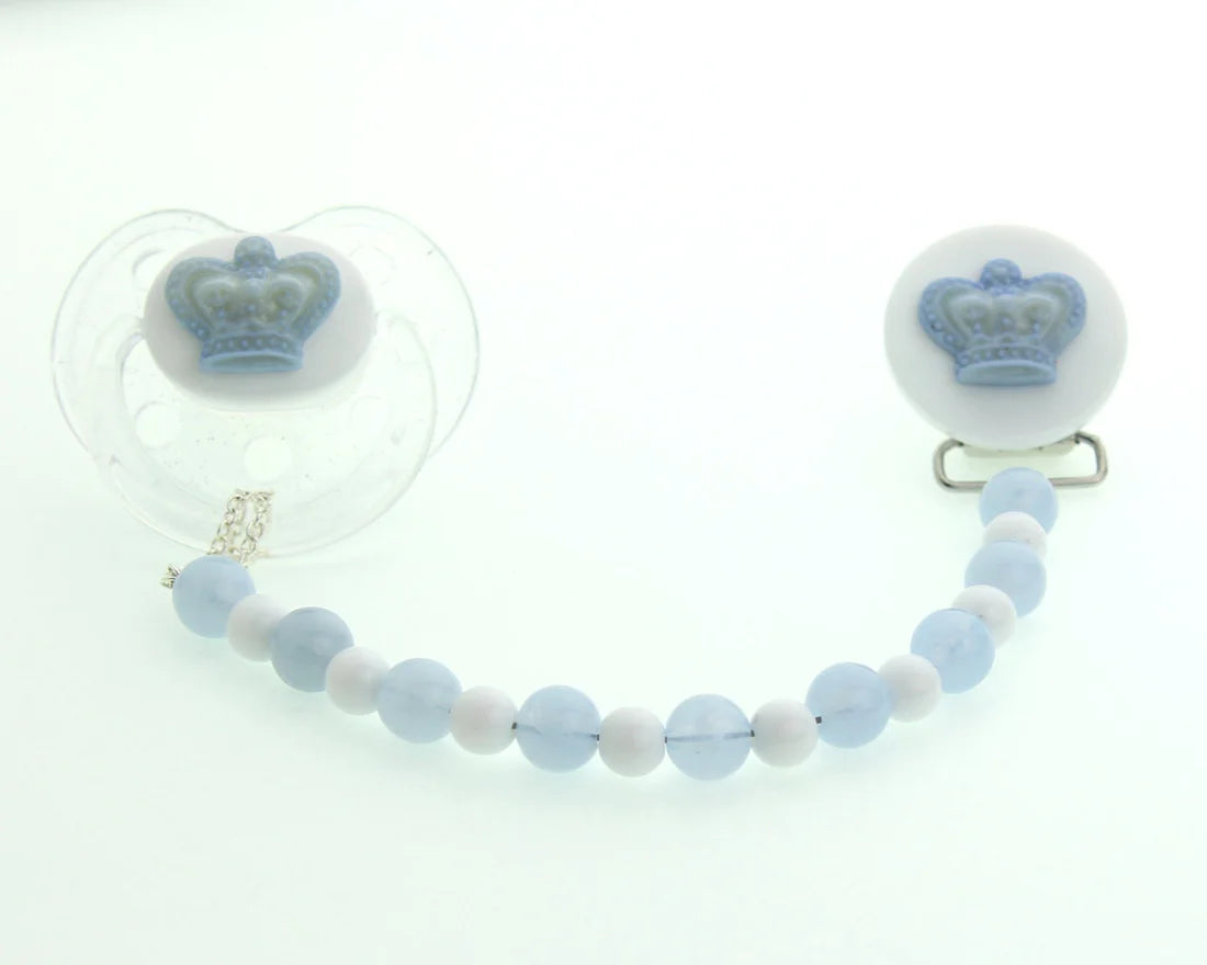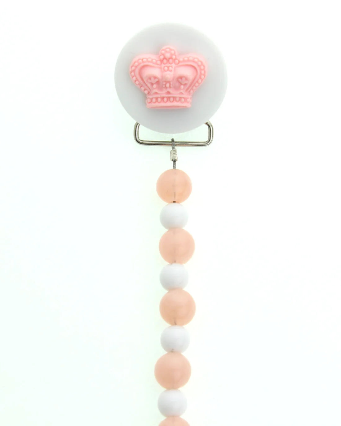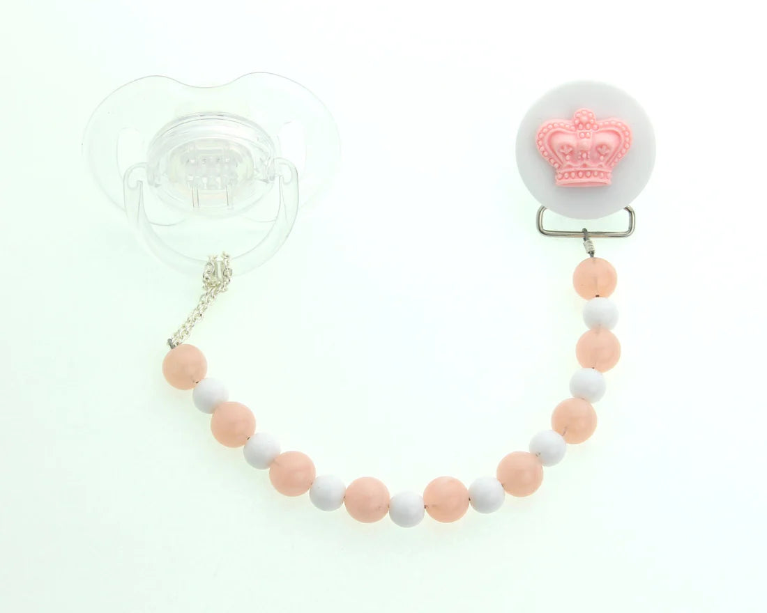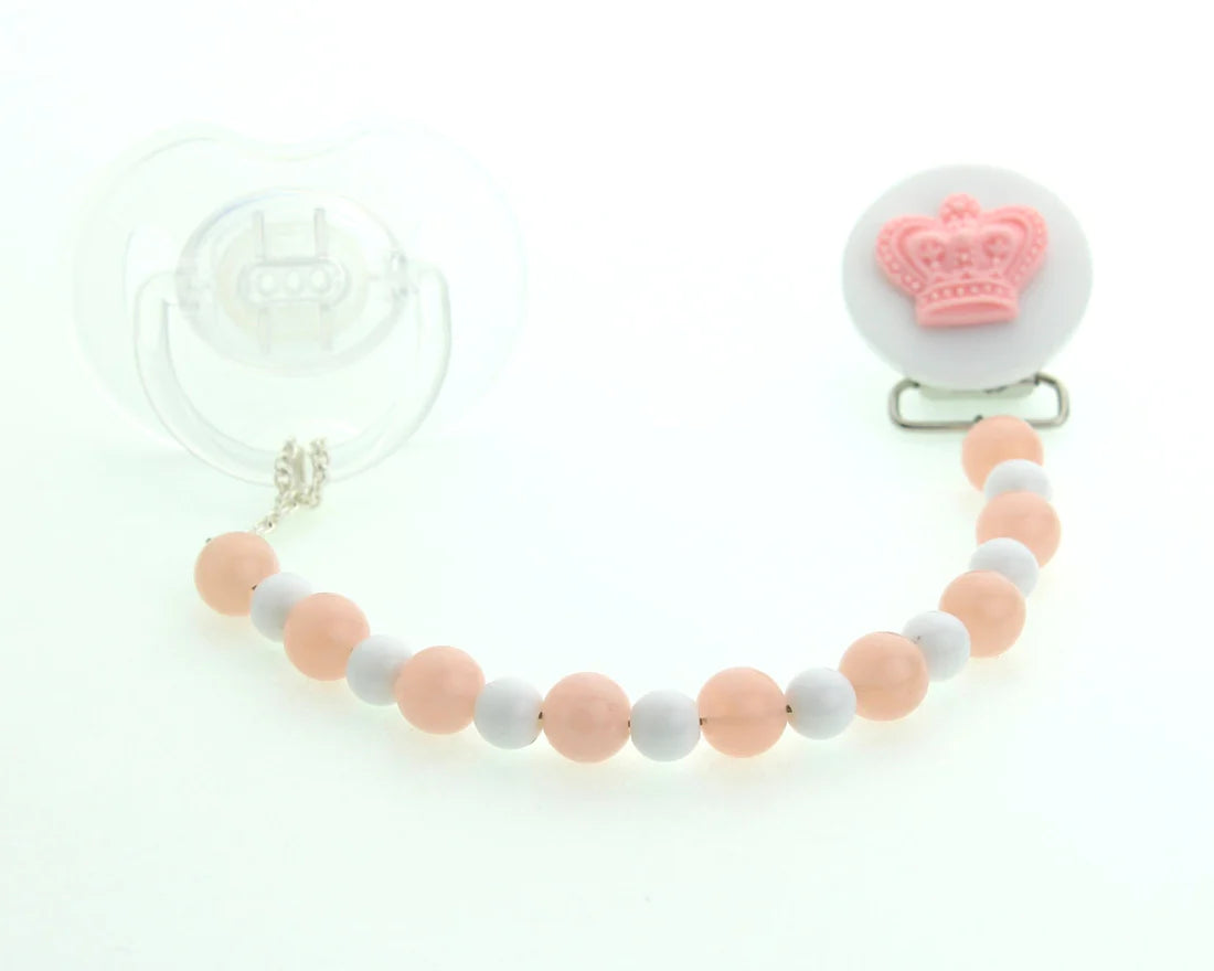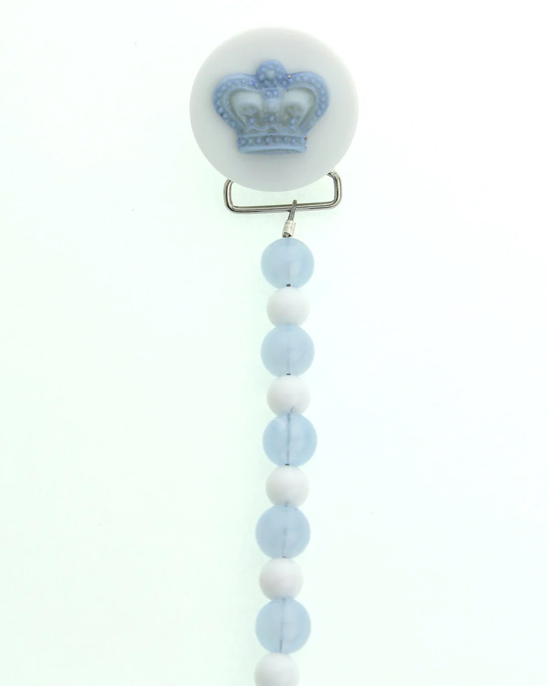 Ivory, Blue, Pink Crown with White and Ivory Matching Beads Pacifier Clip