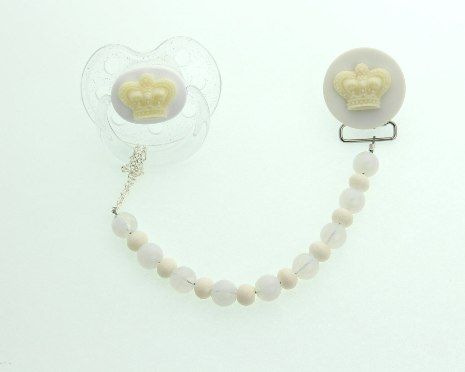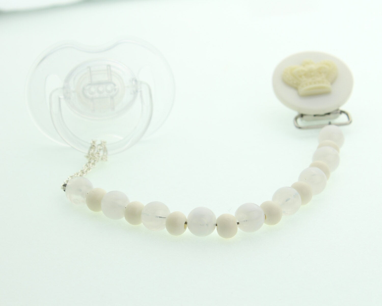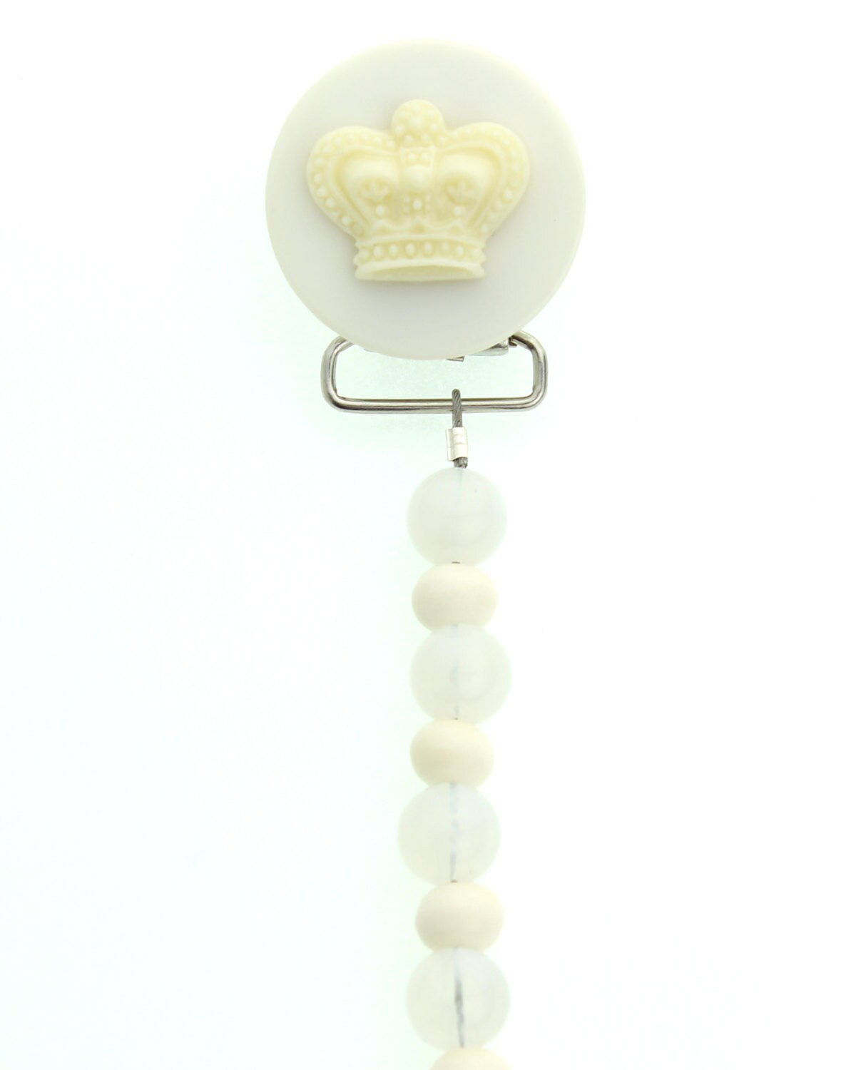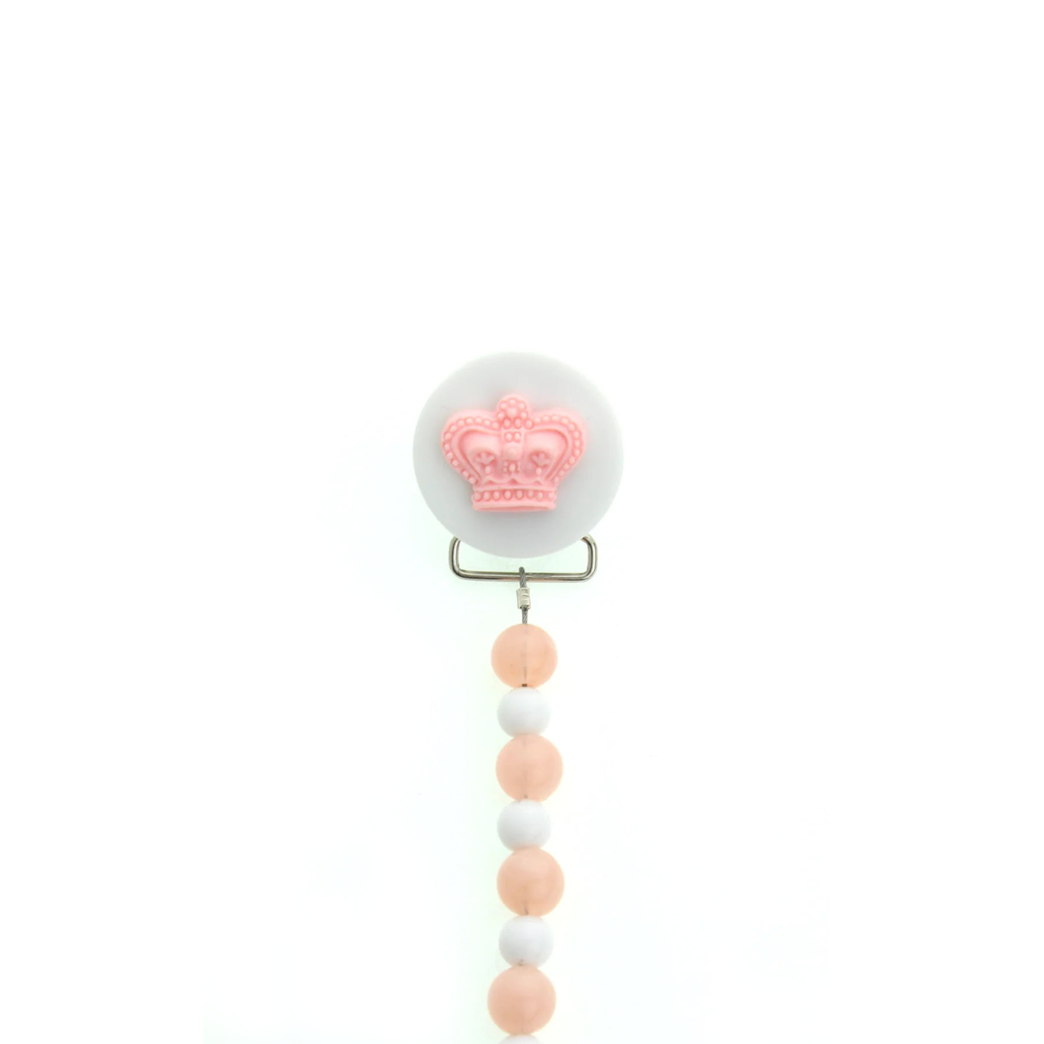 Ivory, Blue, Pink Crown with White and Ivory Matching Beads Pacifier Clip