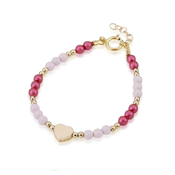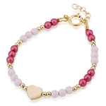This Bracelet will look like a million on your baby's hand. It is made of 14k yellow gold-filled components, pink and purple pearls and pearl heart bead.