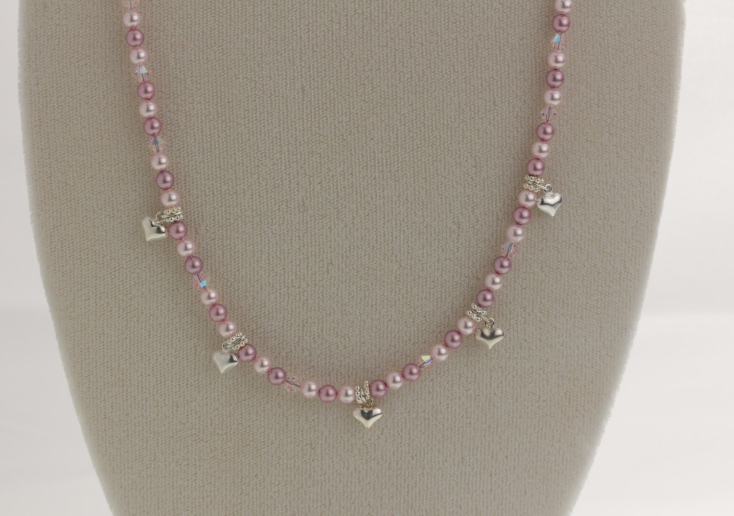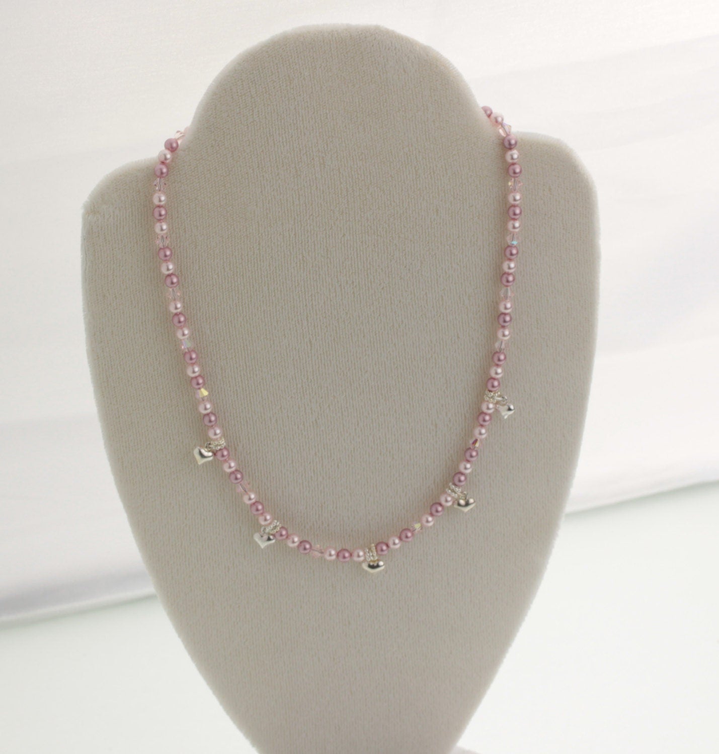 This stunning Necklace is made using 4 mm pink and rose pearls, sterlign silver spacers and sterling silver puffed hearts, it includeds a 2 " inch extender to grow with your child !