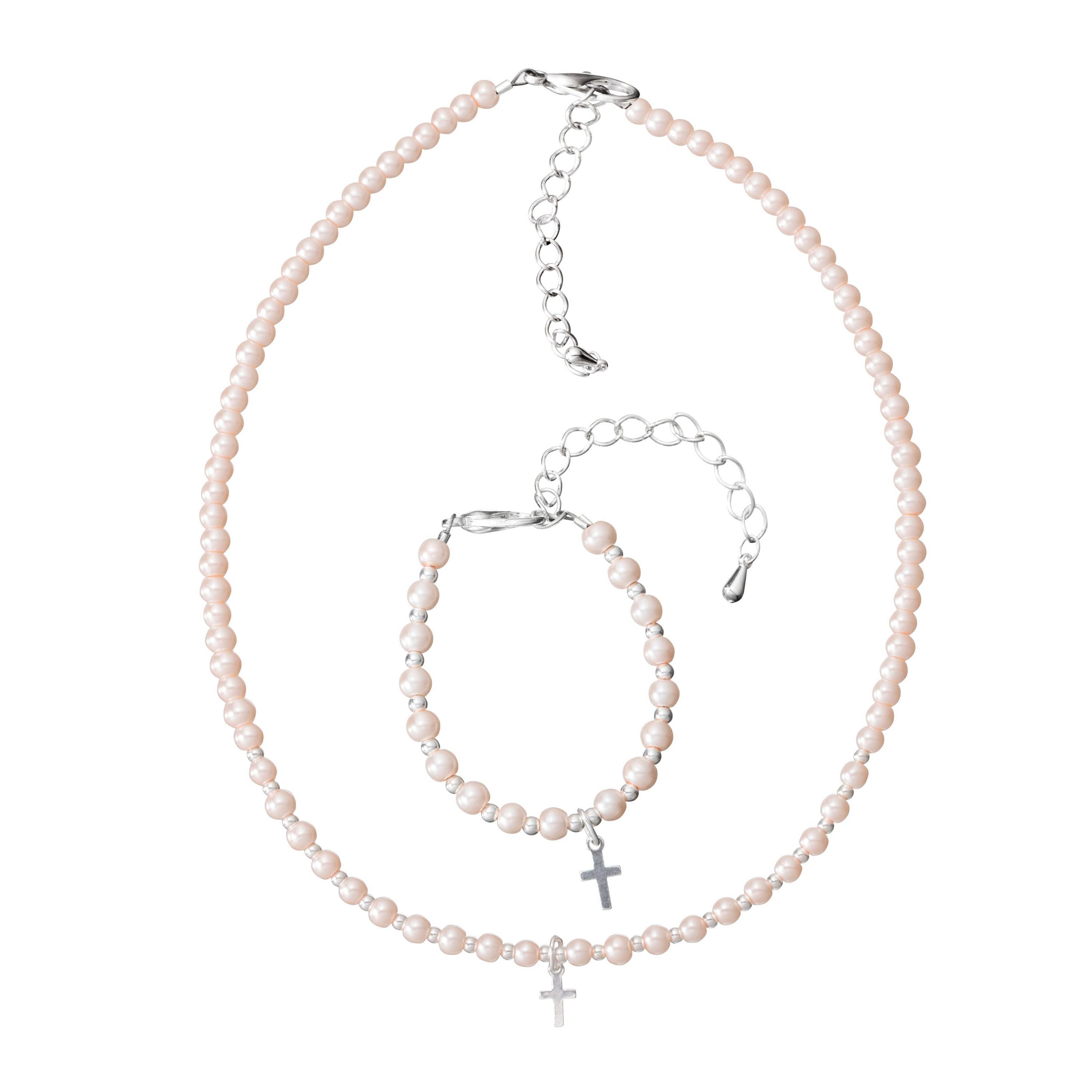 Pink Czech Glass Pearls with Silver Beads and Cross Keepsake Bracelet and Necklace Gift Set (GSNB32)