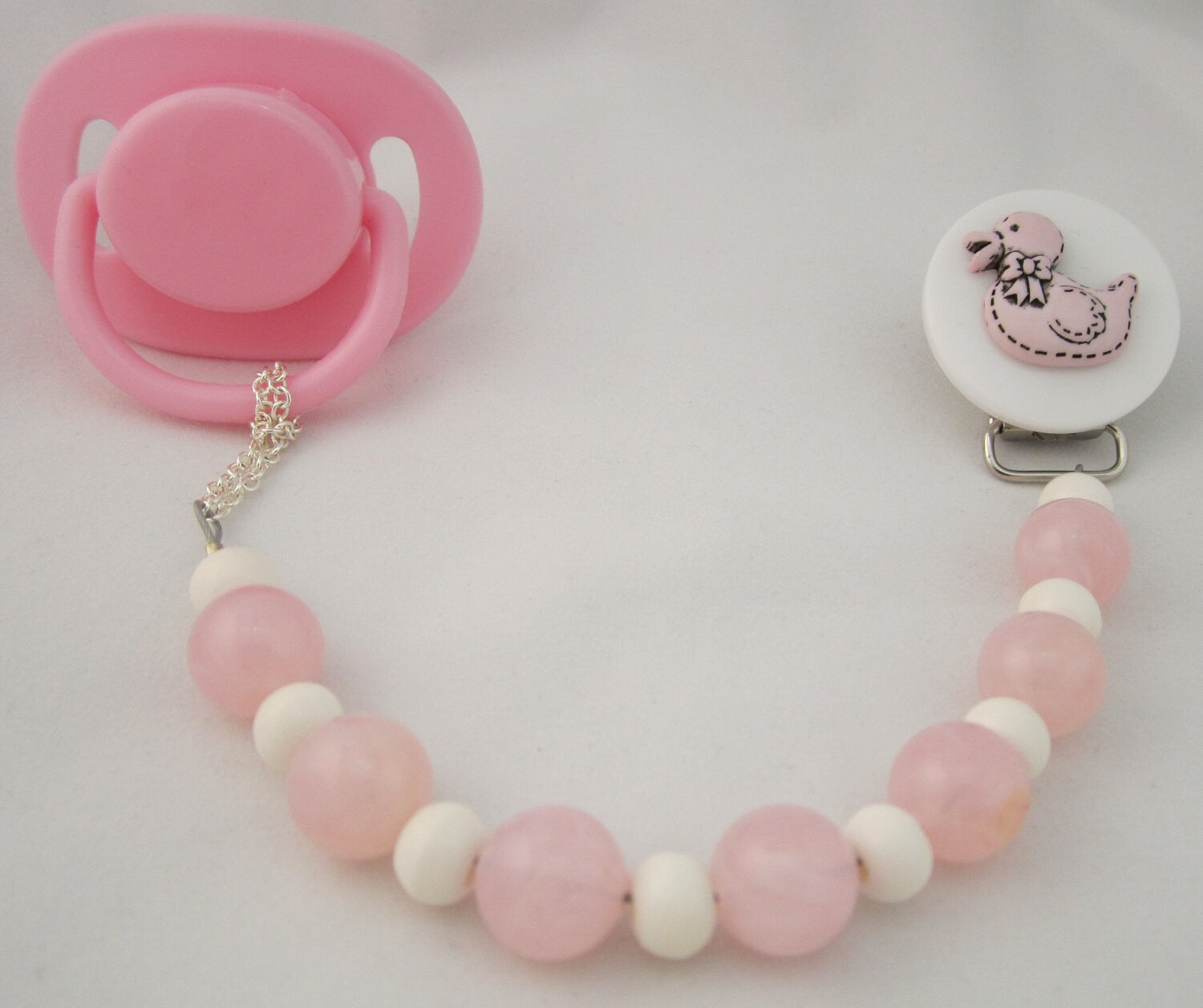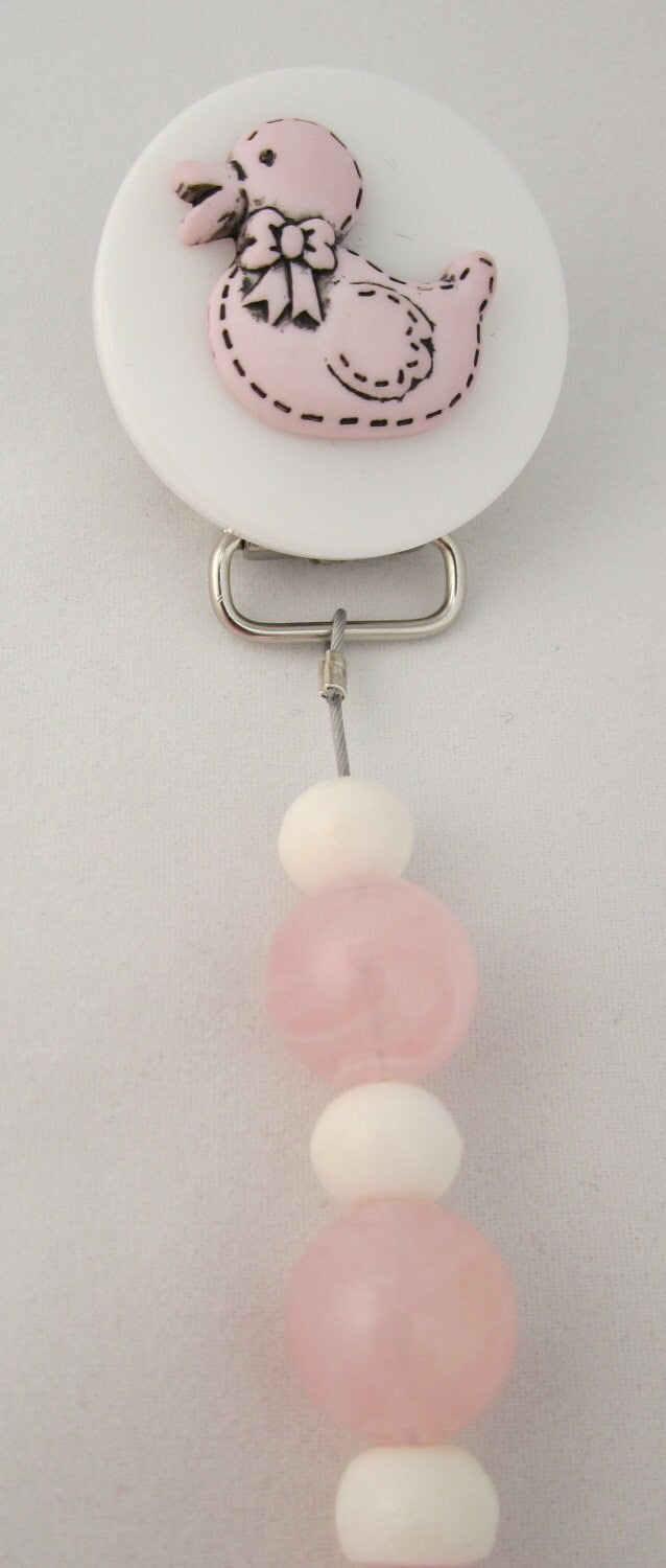 This Adorable Pink Duck Pacifier clip is accented with Stunning Beads and Pearls.