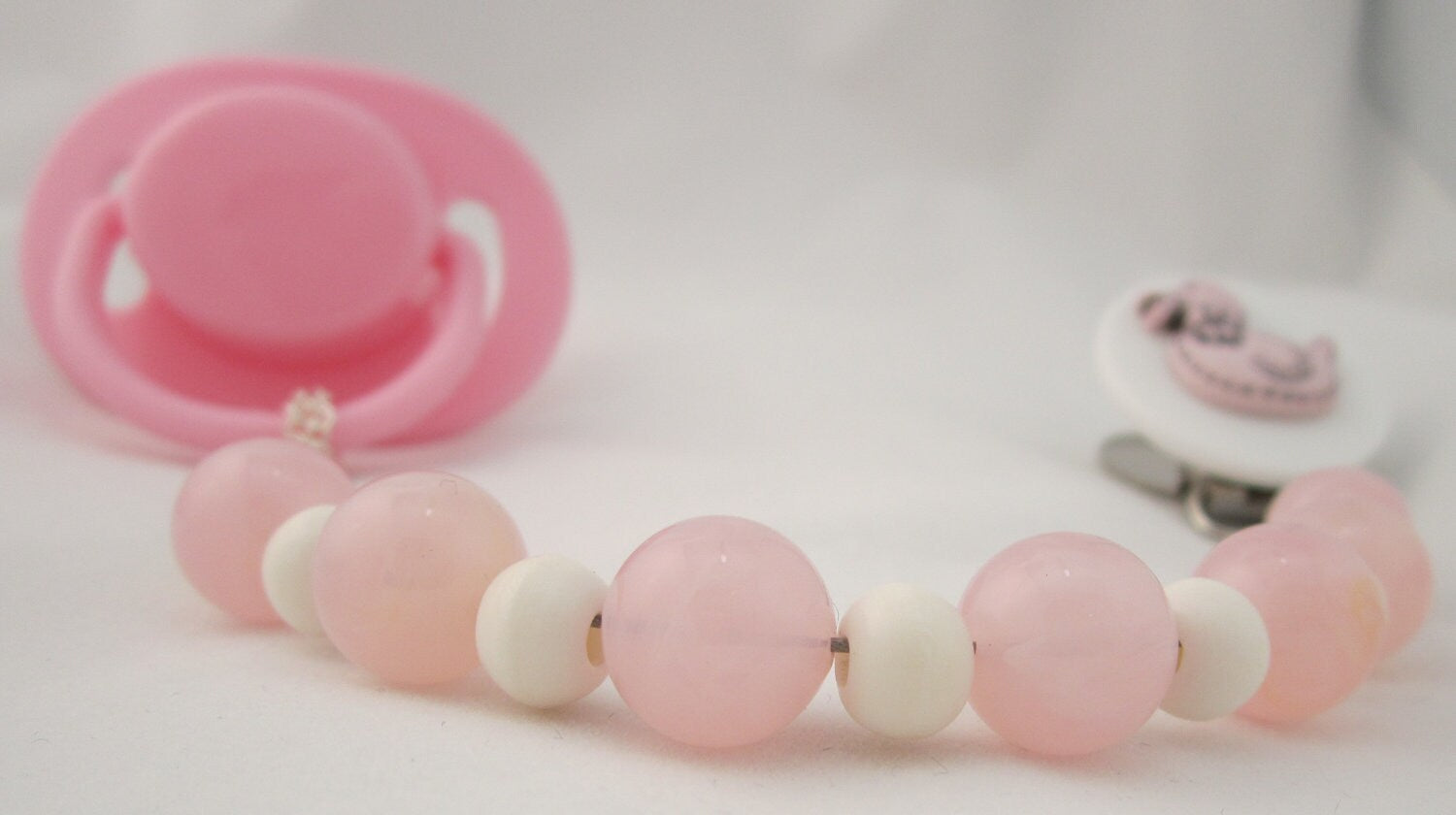 This clip fits all major brands of pacifiers. The beads are strung on 49 Strands of jewelry wire. Each end is triple-secured to guarantee quality and safety. Our team of Professionals Secure and Check each Clip Individually, The Beads are selected from a wide variety, to ensure that we bring you a safe, secure and Stunning Pacifier Clip.