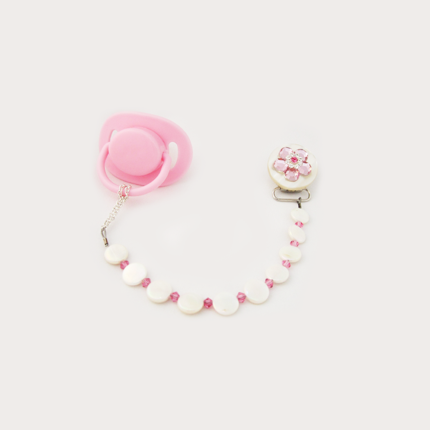 Pink Flower Pacifier clip with Stunning Mother of Pearls (CMPP)
