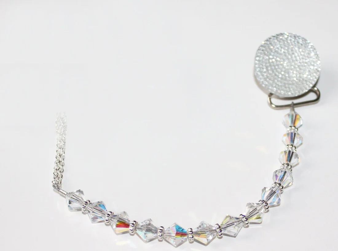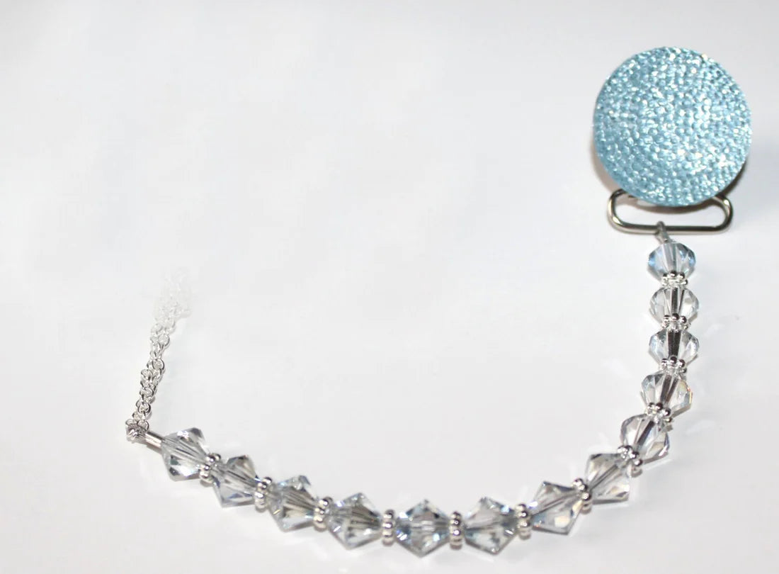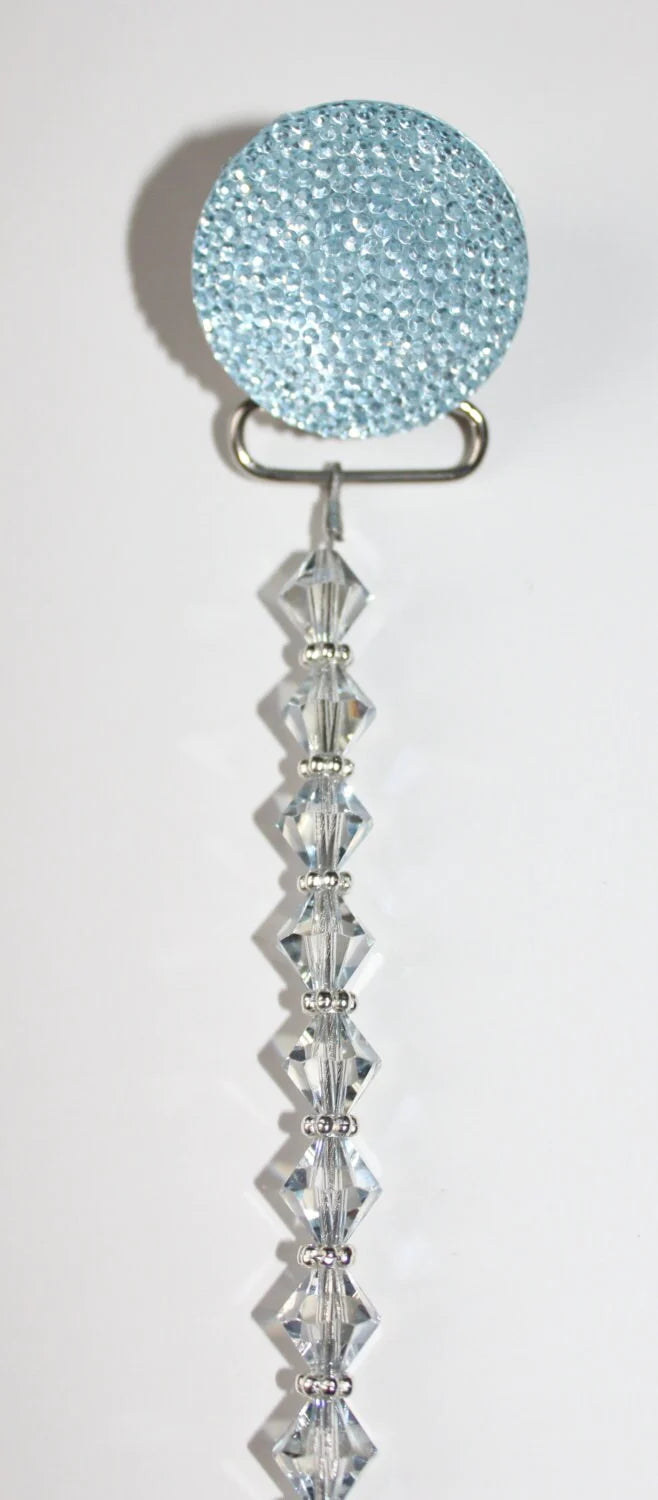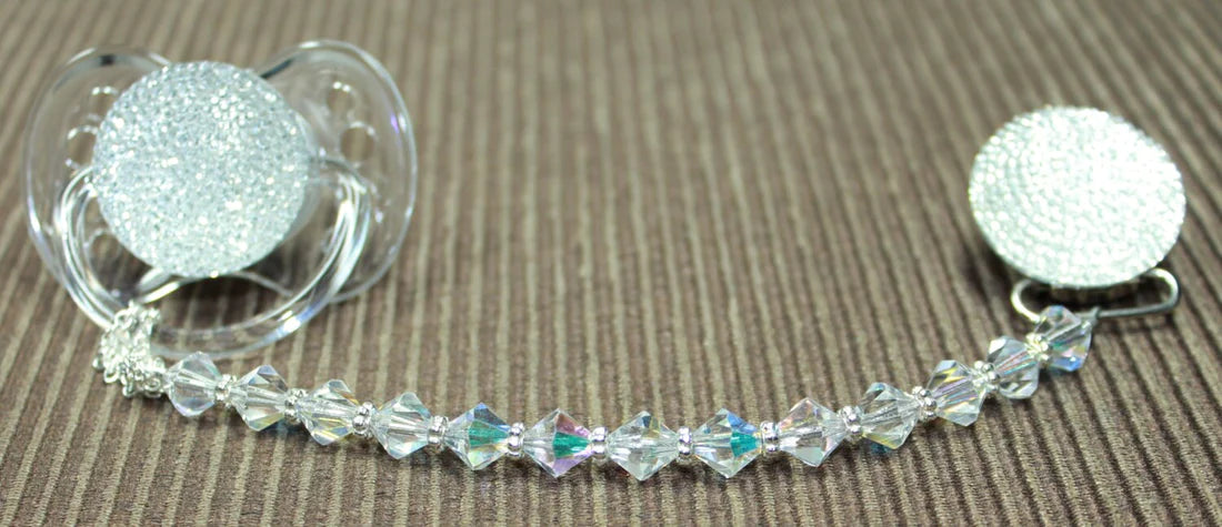 This clip fits all major brands of pacifiers. The crystals are strung on 49 Strands of jewelry wire. Each end is triple-secured to guarantee quality and safety. Our team of Professionals Secure and Check each Clip Individually, The crystals are selected from a wide variety, to ensure that we bring you a safe, secure and Stunning Pacifier Clip.