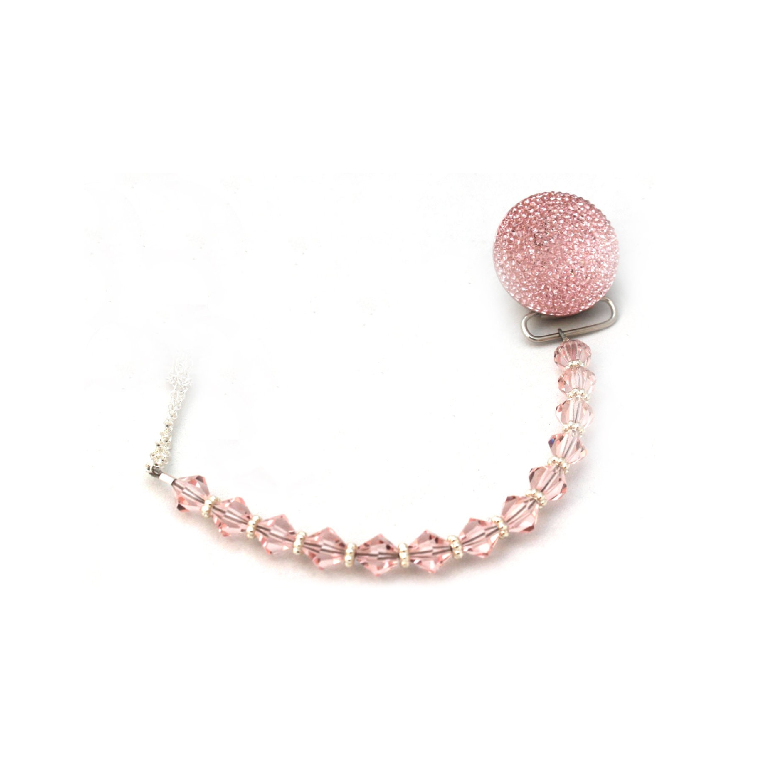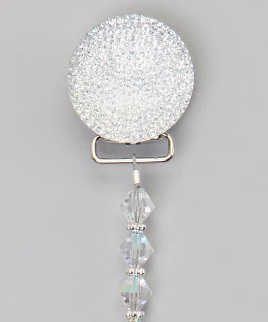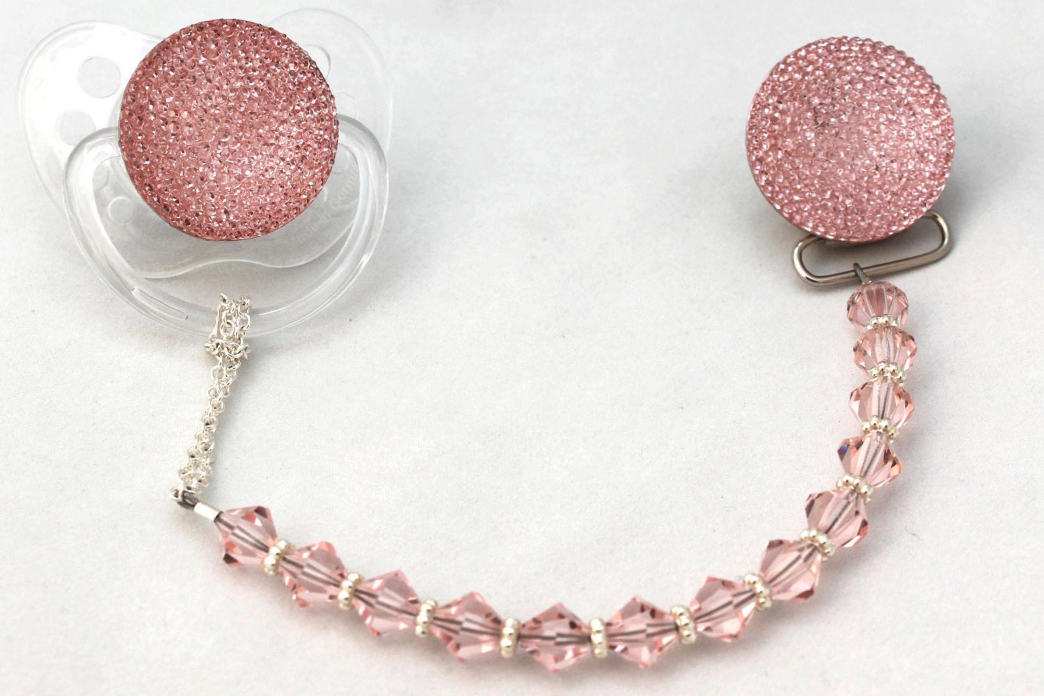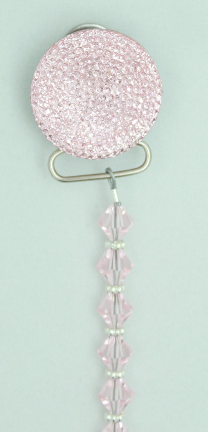 This clip fits all major brands of pacifiers. The crystals are strung on 49 Strands of jewelry wire. Each end is triple-secured to guarantee quality and safety. Our team of Professionals Secure and Check each Clip Individually, The crystals are selected from a wide variety, to ensure that we bring you a safe, secure and Stunning Pacifier Clip.