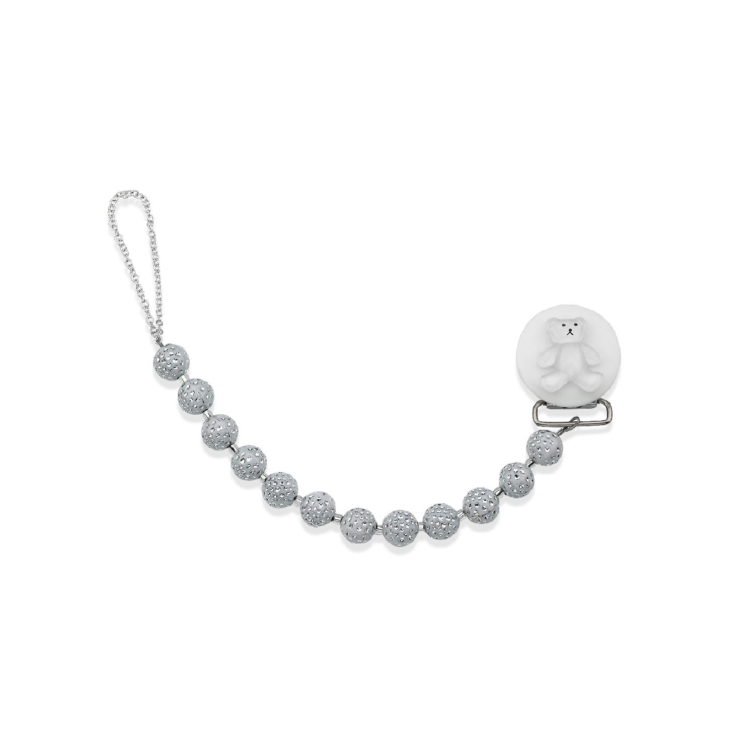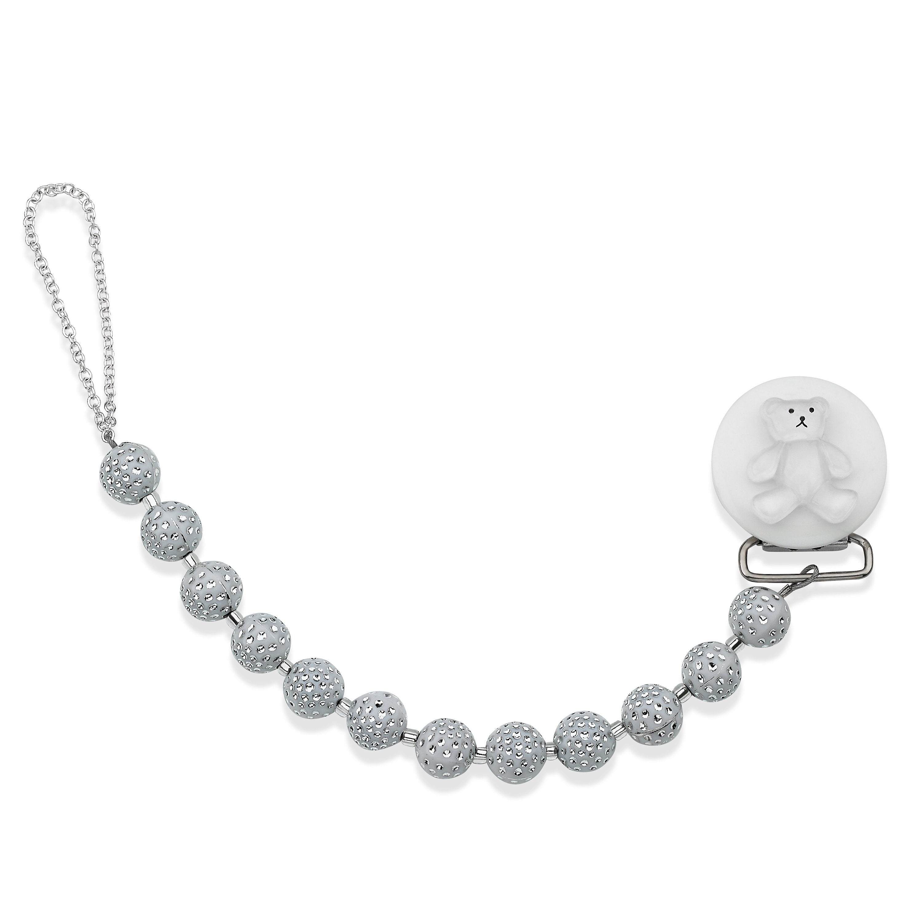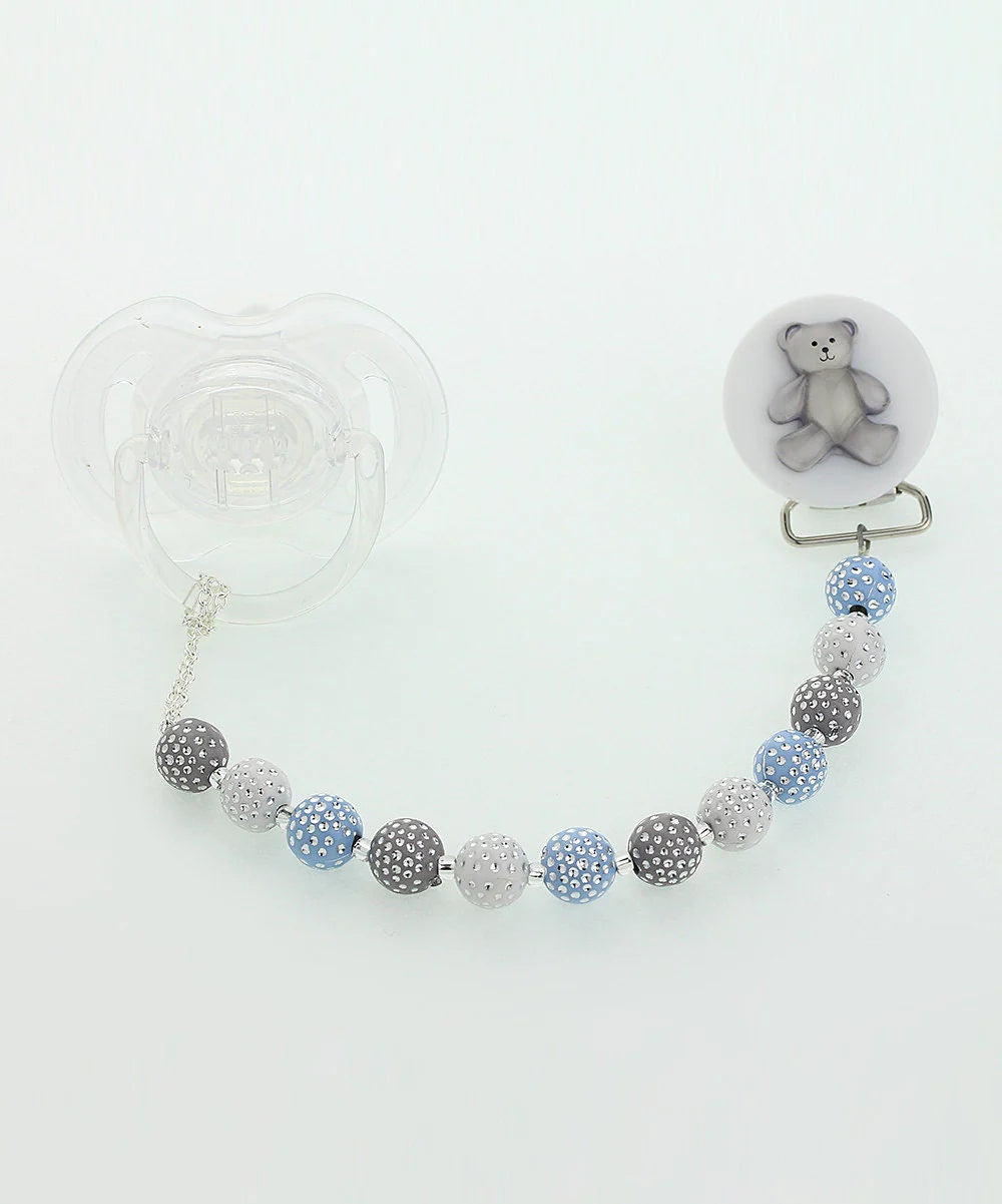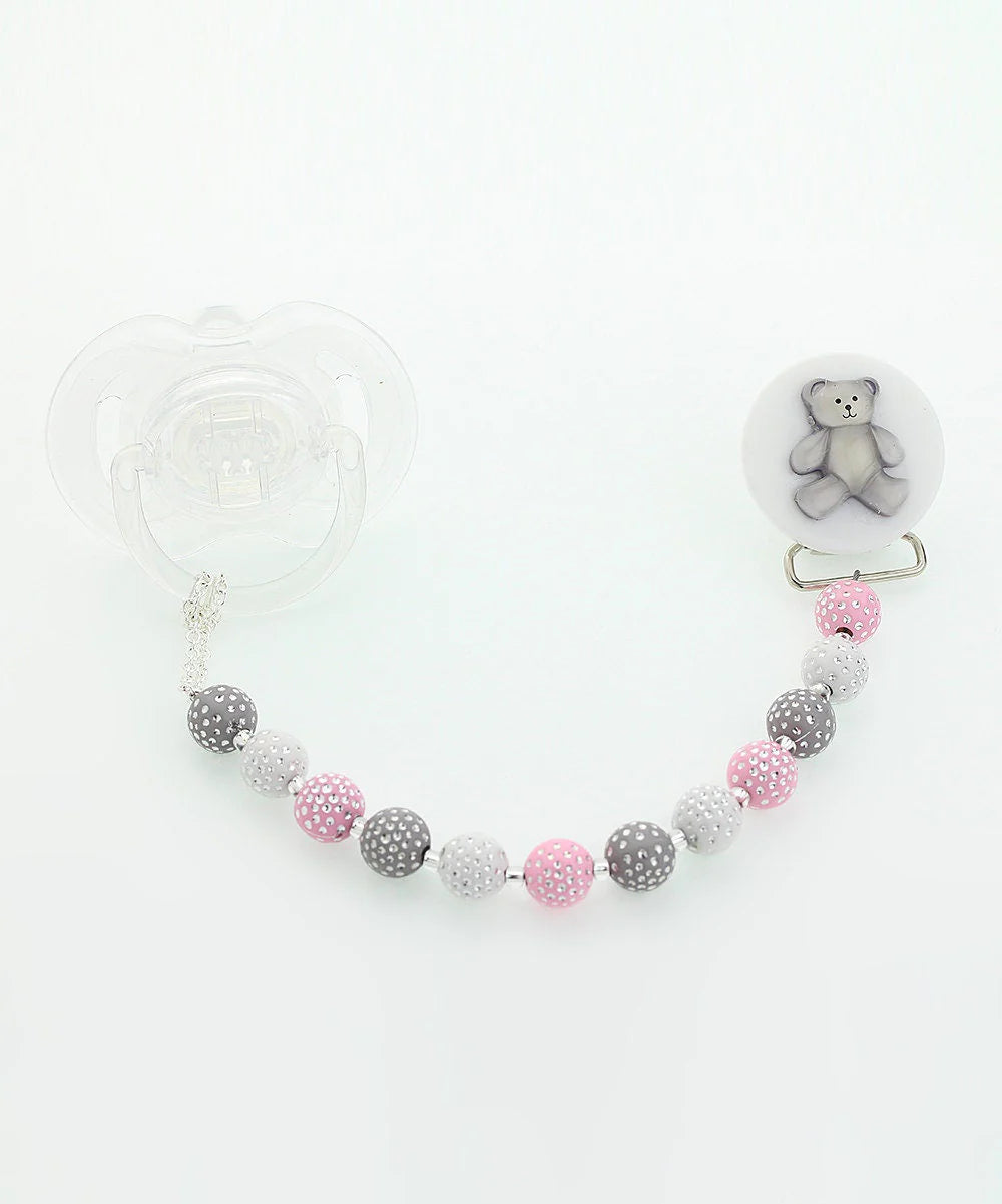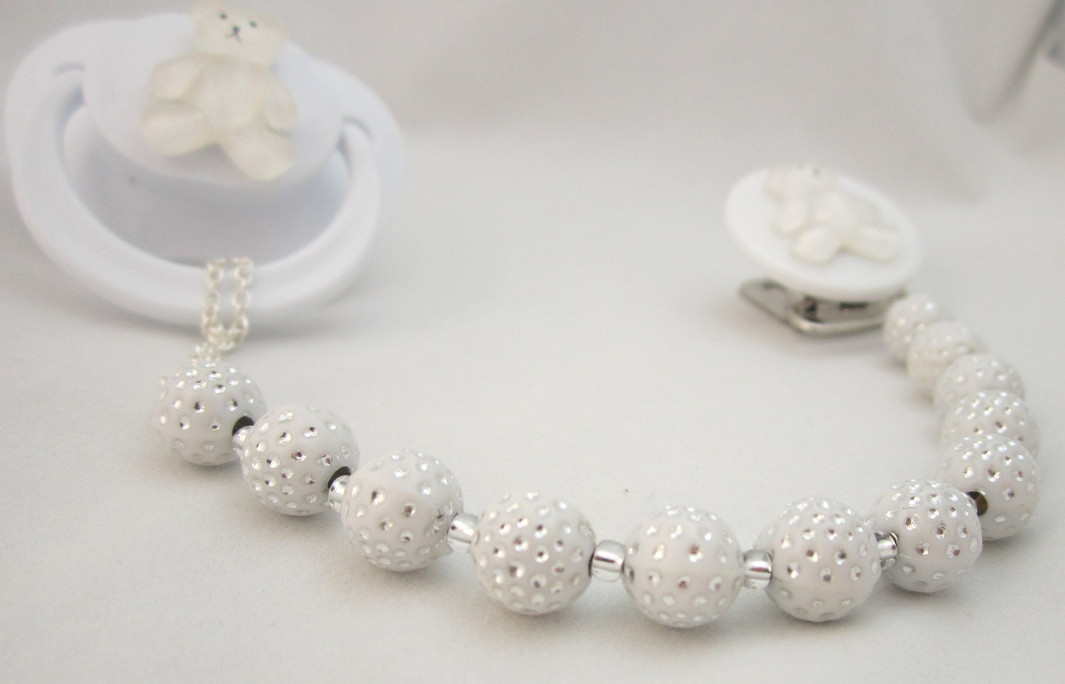 White Beaded Teddy Bear Pacifier Clip