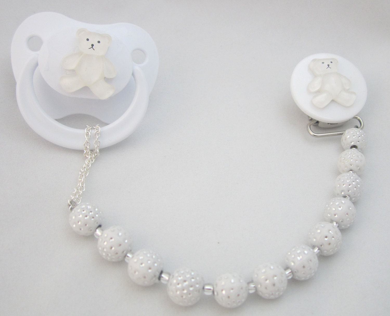White Beaded Teddy Bear Pacifier Clip (CPW)