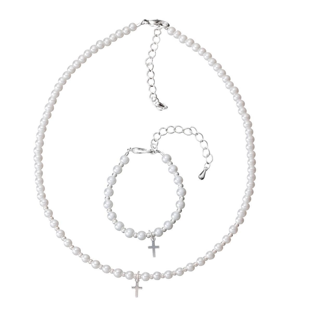 White Czech Glass Pearls with Silver Beads and Cross Keepsake Bracelet and Necklace Gift Set (GSNB31)